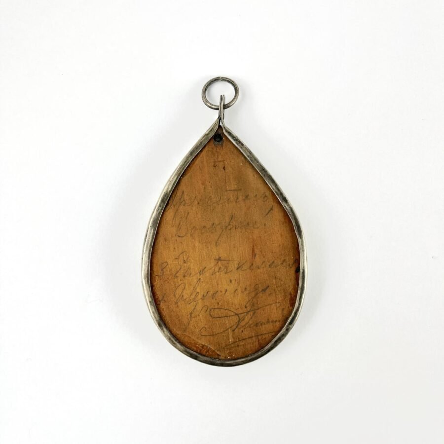 Ícono ruso ortodoxo portátil en miniatura, montado en un relicario o colgante en plata en forma de lágrima y representando la imagen de un ángel custodio pintada al óleo sobre madera con destaques en dorado e inscripción «Св. ангел хранитель» («Santo Ángel de la Guarda»). 10,5 x 6, 5 cm. Al dorso presenta inscripción manuscrita a lápiz: «Cristo ha resucitado» (en ruso), y dedicatoria en inglés: «Three easter kisses and blessings», ambas posiblemente de puño y letra de la zarina Alejandra Fiódorovna, según análisis de la casa Christie’s. Esta clase de íconos fueron usados como objeto devocional en la tradición cristiana ortodoxa (rusa, griega, serbia, etc.) para ser llevados como protección personal, adquiriendo su mayor popularidad entre los siglos XVII y XX. Ex colección Familia Gorchakov.