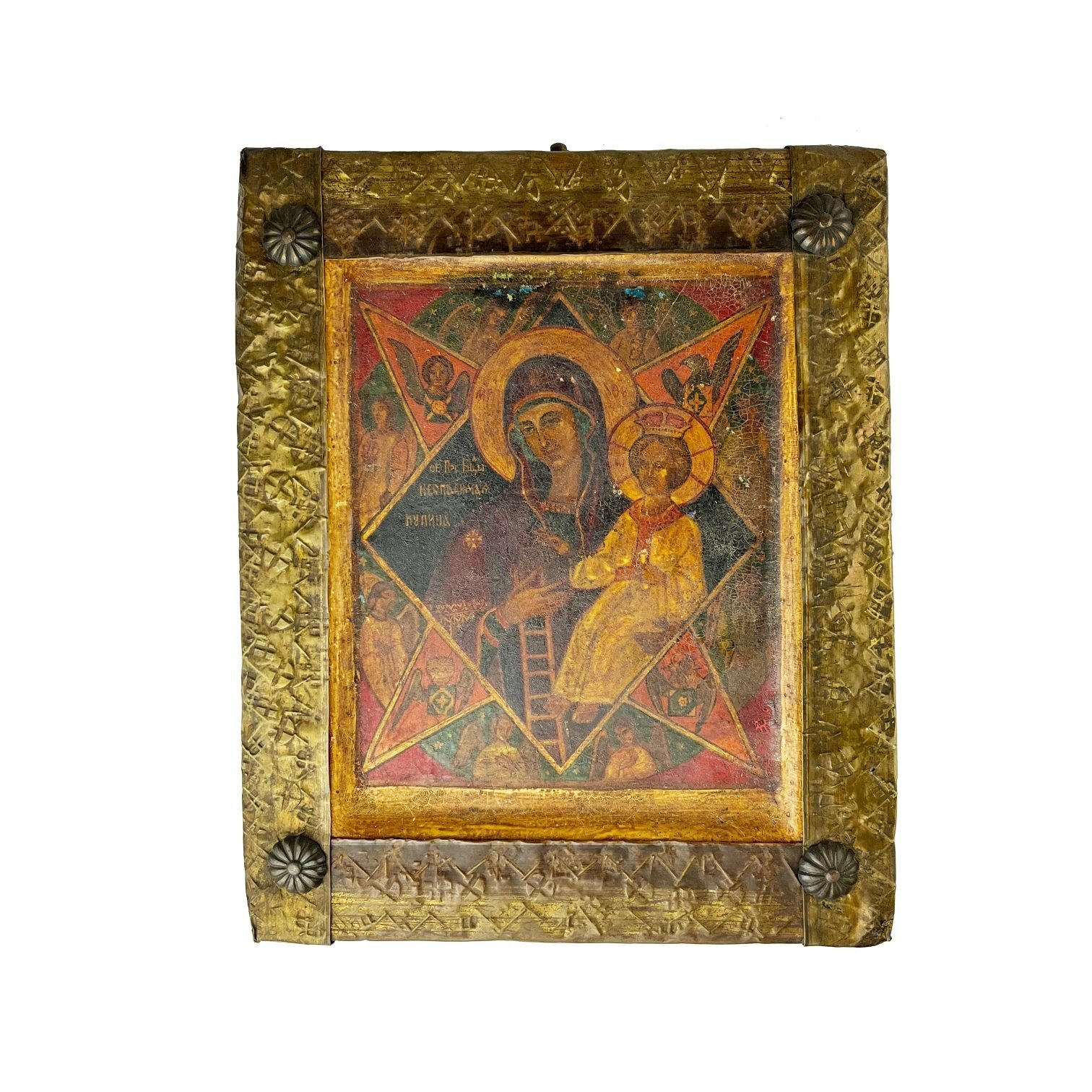 Ícono ruso. Óleo sobre madera con destaques en dorado. «Virgen con Niño y Santos.» Marco en bronce repujado. 21 x 17 cm.