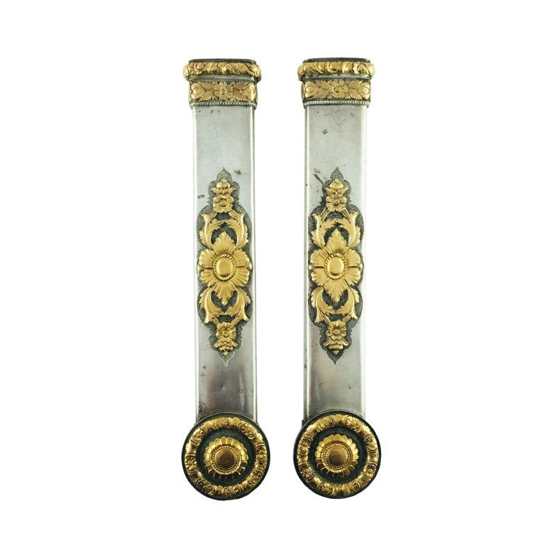 Importante conjunto de estribos y pasadores uruguayos c. 1890 con punzón del platero italiano José Mantegani. Par de estribos tipo campana en plata y oro cincelados «hojas y flores», esculturados «aves», con gancho cincelado y esculturado «animales mitológicos» y cartelas con iniciales «P.G.». 25 x 17.5 x 10.5 cm. Par de pasadores chato de estribera en plata y oro cincelados «hojas y flores». 14.5 x 5 cm. Peso total 2.770 gr.