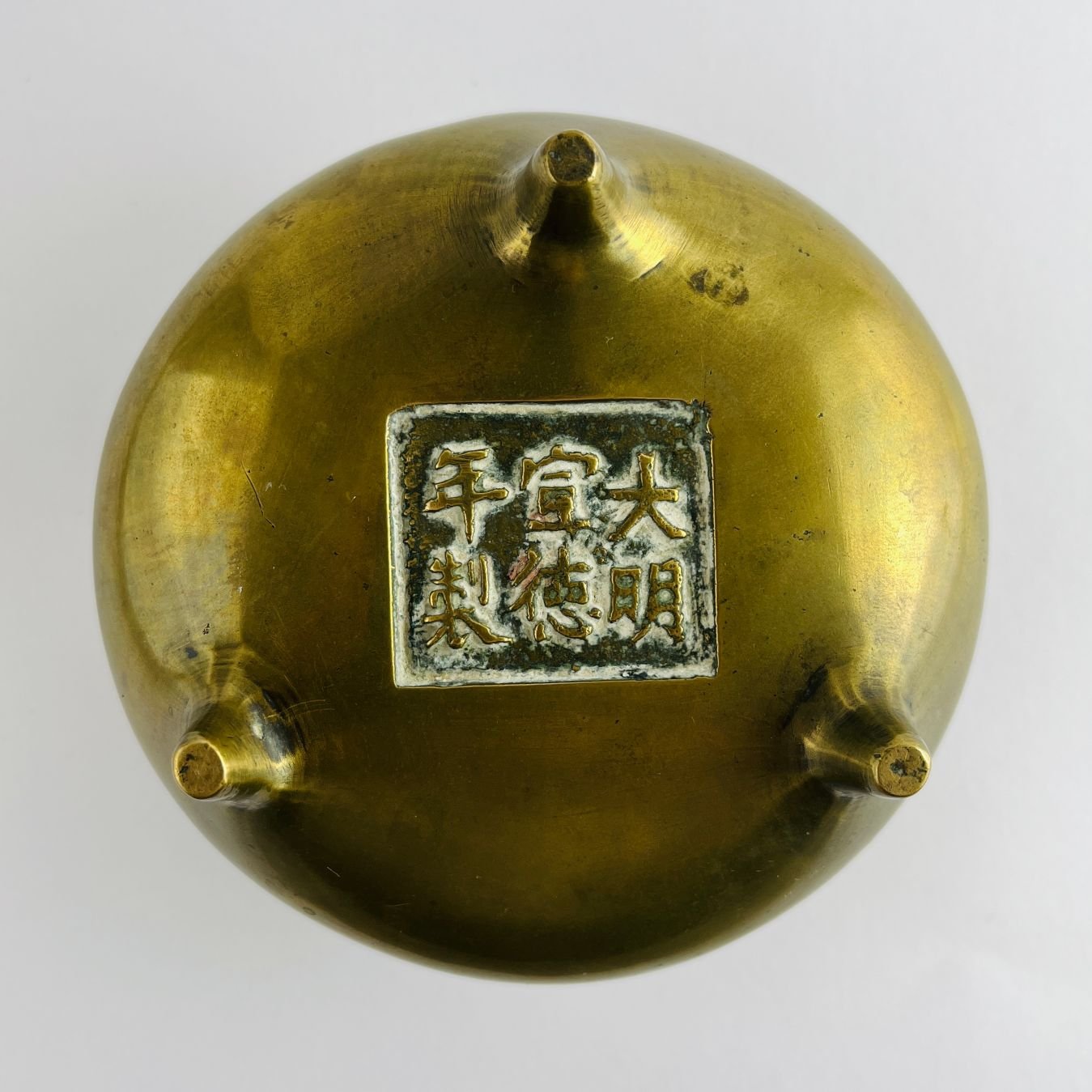 Incensario chino en bronce. Marca del período en la base. 8 x 13.5 cm.