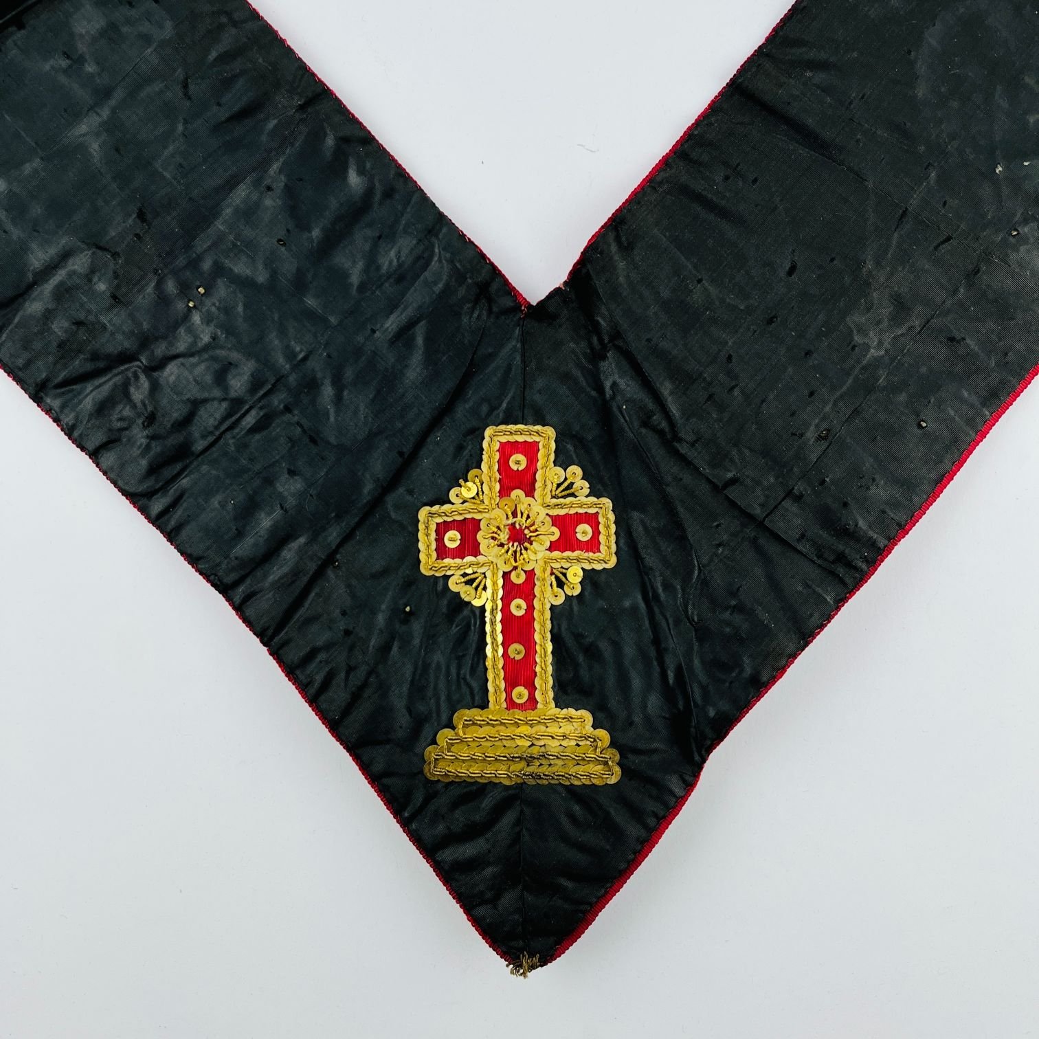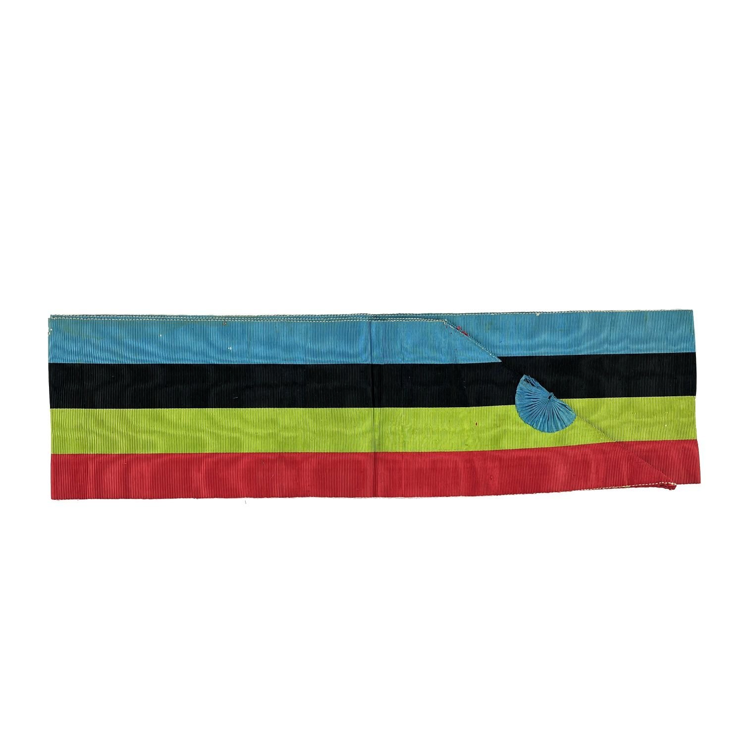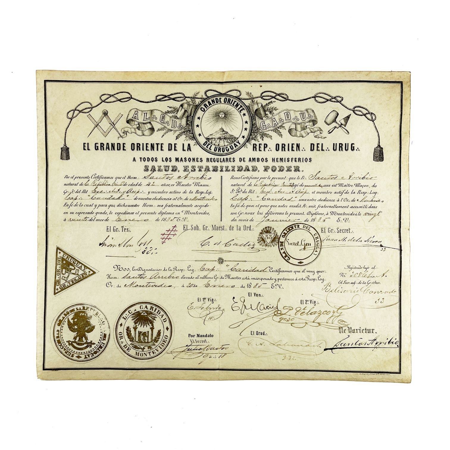 Conjunto de piezas pertenecientes al Gral. Herminio Santos Arribio: certificado impreso, manuscrito y sellado por el cual la logia masónica «El Grande Oriente de la República Oriental del Uruguay» deja constancia de que Arribio «es Maestro Masón Gr. 3», expedido en enero de 1885; tres bandas masónicas, una en seda celeste, negra, verde y roja; otra en seda celeste y roja bordada «simbología masónica» en filigrana dorada; otra en seda color natural, averiada, bordada «simbología masónica» en filigrana dorada y seda roja, correspondiente al grado 33; y un collarín en seda roja bordada «simbología masónica» en filigrana dorada y plateada.