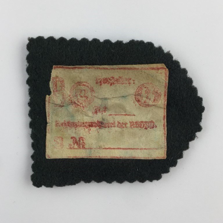 «Escudo de campaña» alemán en bronce estampado pátina oscura, diseño creado durante la Segunda Guerra Mundial. «Escudo de Stalingrado.» Presentado sobre felpa verde, con etiqueta original de papel en anverso.