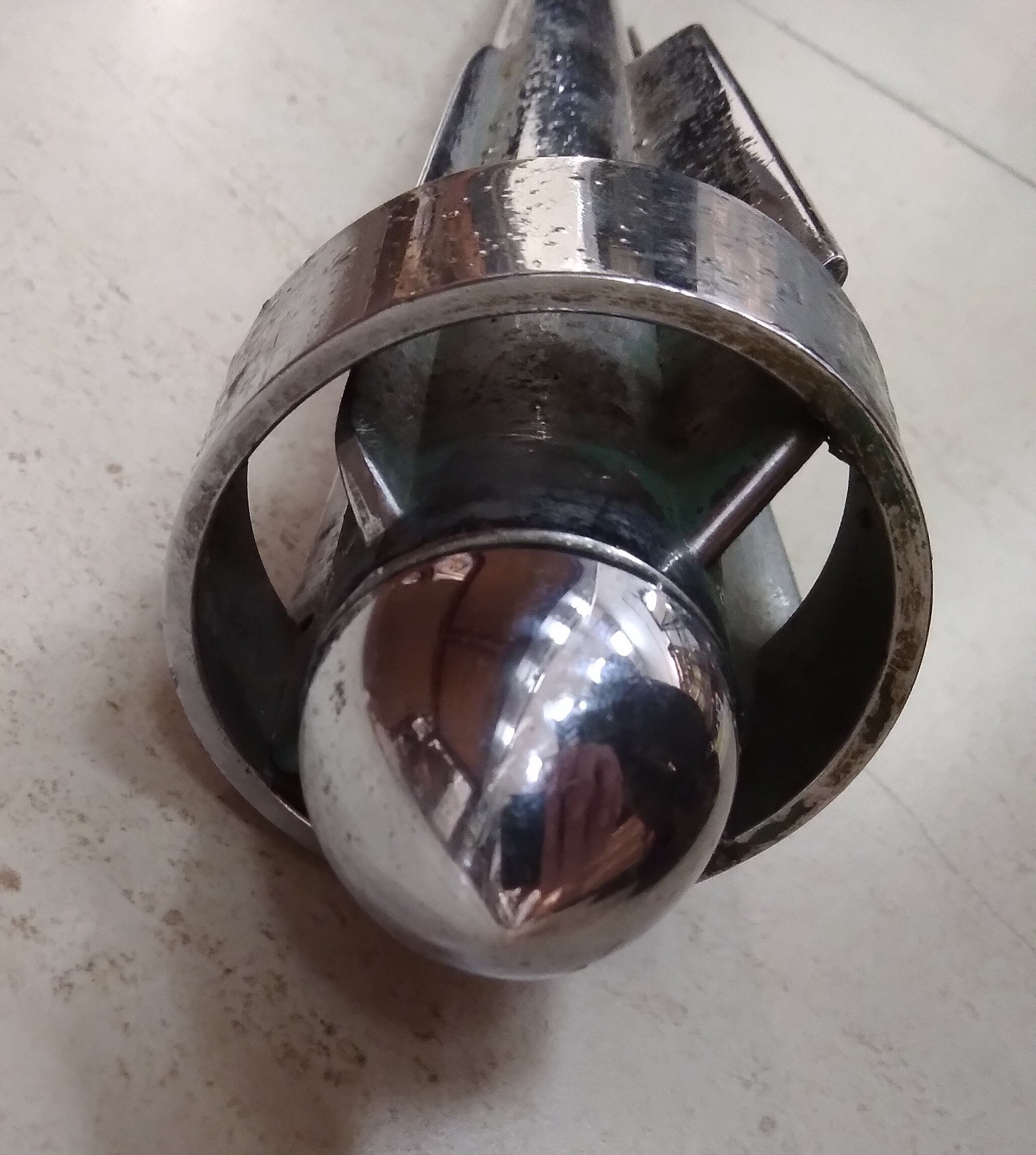 Adorno para capot de automóvil en metal plateado esculturado «torpedo», con marca de fabricante no identificado. Largo 35 cm.