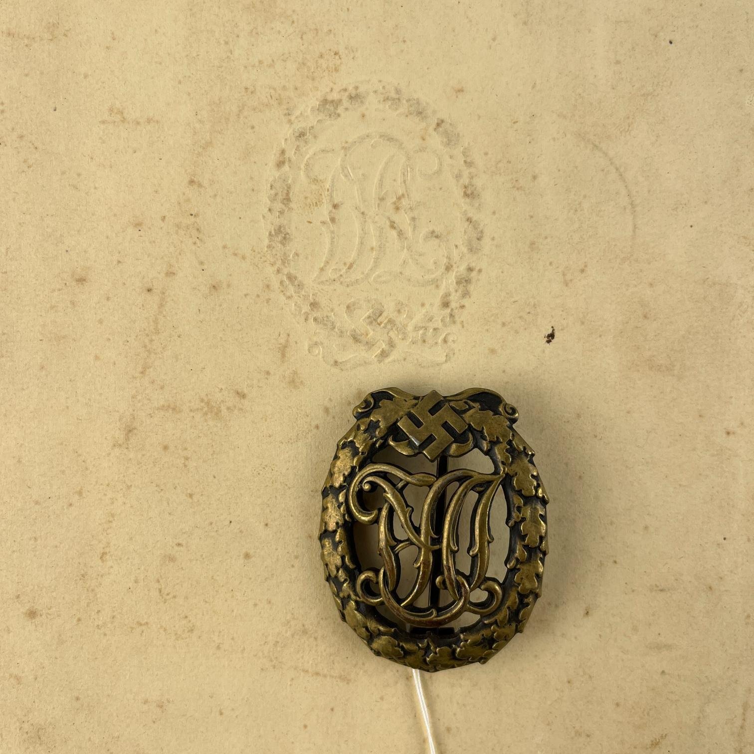 Insignia civil alemana época nacionalsocialista perteneciente a DRL o Federación Nacionalsocialista del Reich para la Educación Física. Con diploma de entrega.