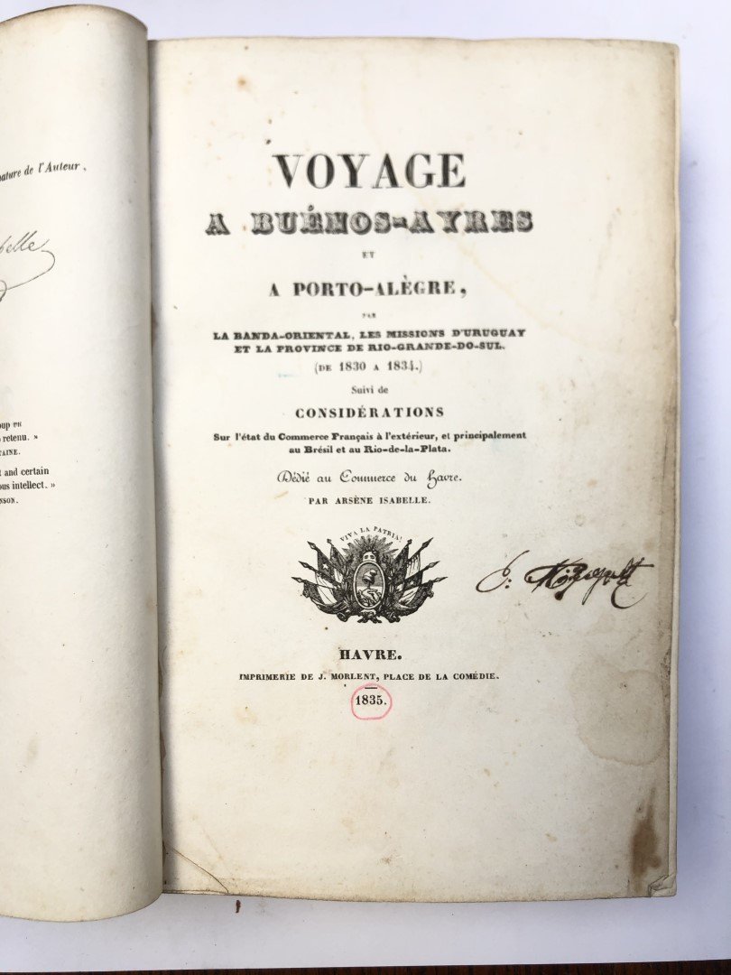 ISABELLE, Arsene: Voyage a Buenos-Ayres et a Porto Alegre, par la banda Oriental (…). Havre, Impresión de J. Morlent, Place de la Comedie. 1835. Tapa desprendida.