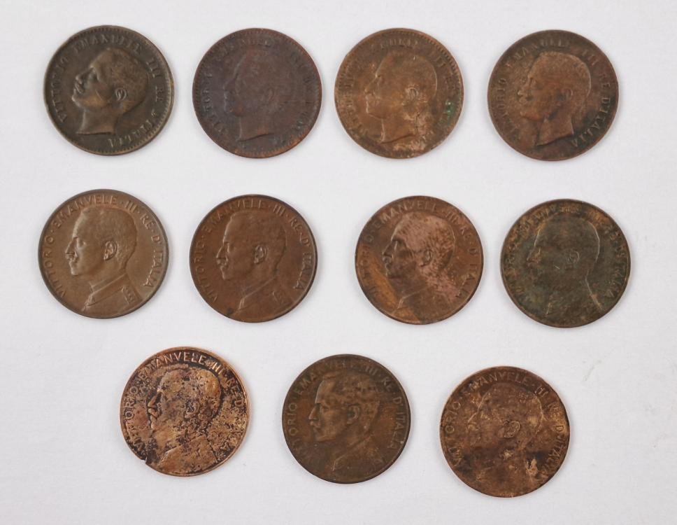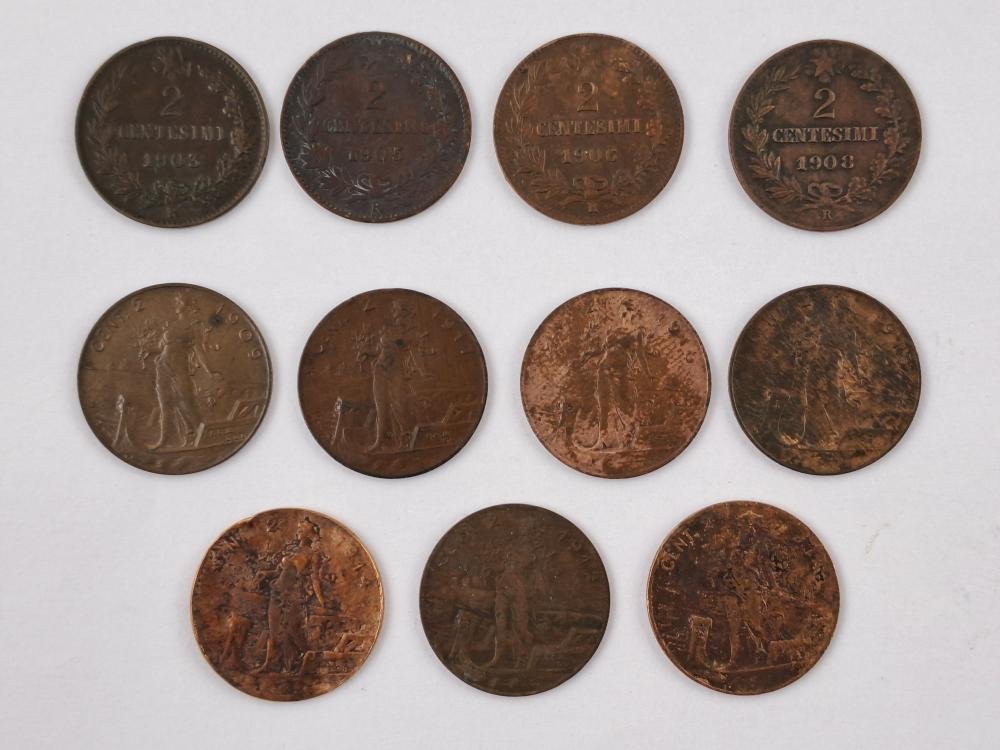 Once monedas italianas denominación 2 centésimos de los años 1903, 1905, 1906, 1908 (“estrella”), 1909, 1911, 1912, 1914, 1915, 1916 y 1917 (“alegoría en proa”).