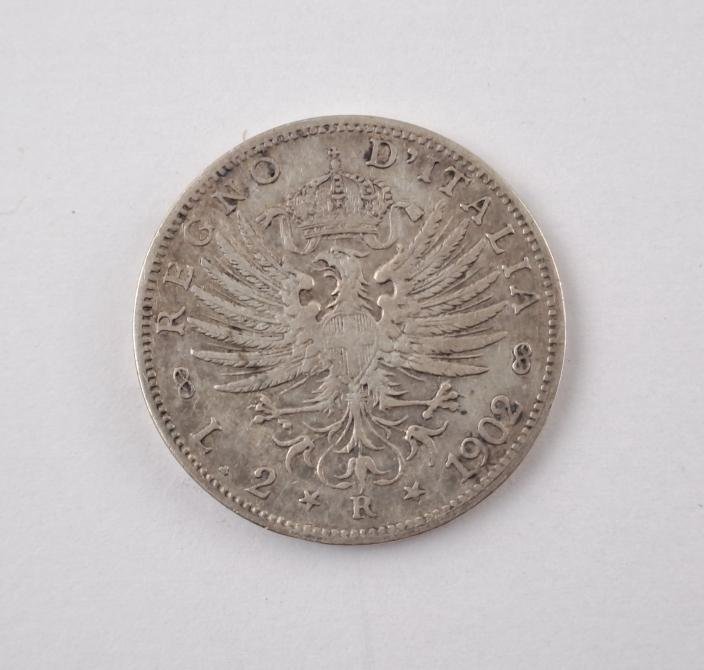 Moneda italiana en plata 835 denominación 2 liras del año 1902. Peso: 10 gr aprox.