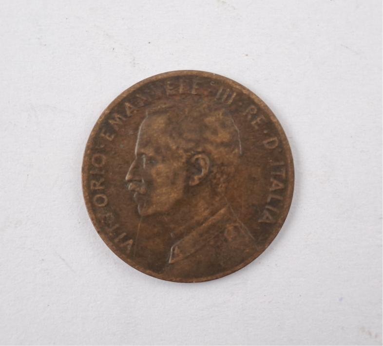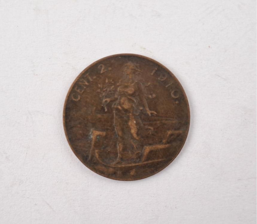 Moneda italiana denominación 2 centésimos del año 1910, decorada “Alegoría en proa”.