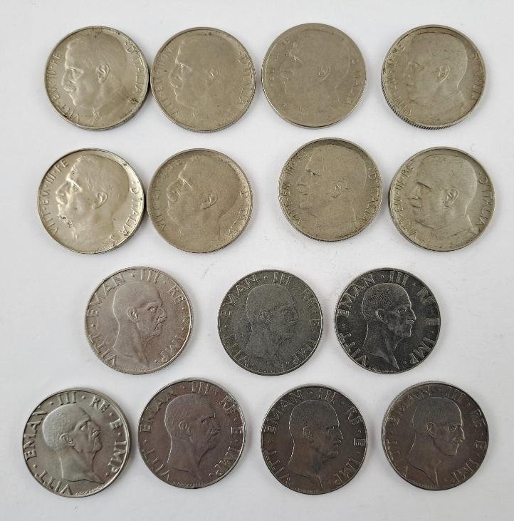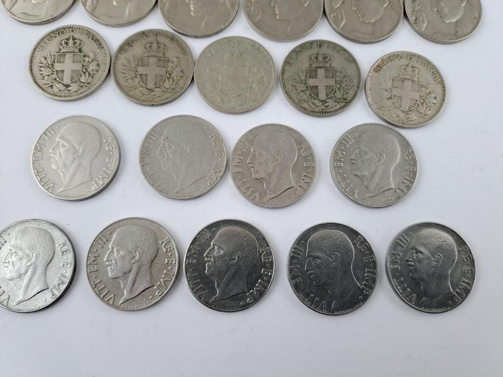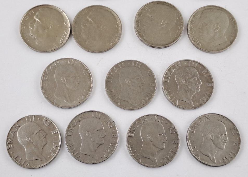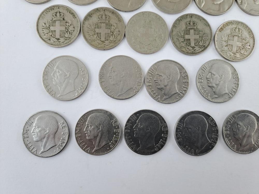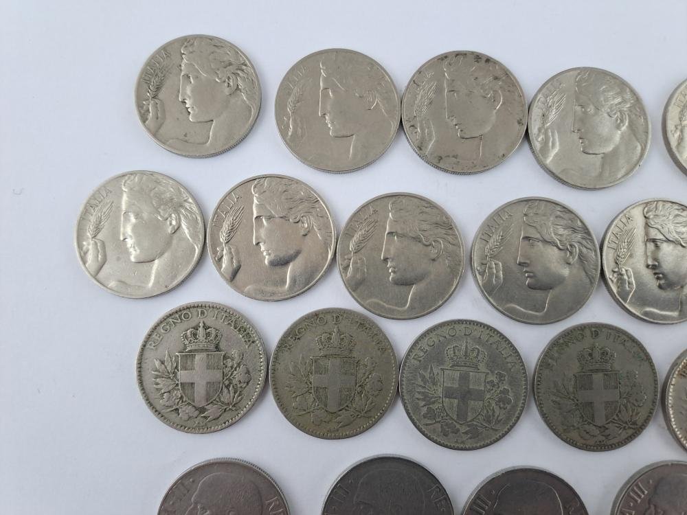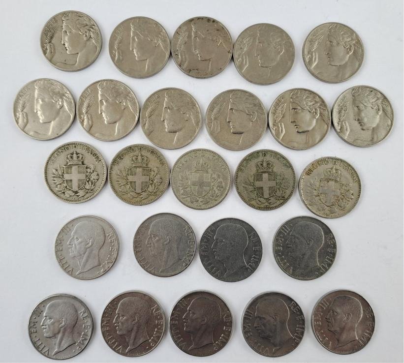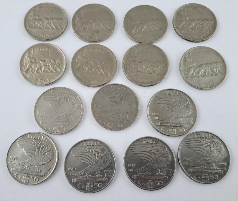 Cuarenta monedas italianas: veinticinco de 20 centésimos, de los años 1908, 1909, 1910, 1911, 1912, 1913, 1914, 1919, 1920, 1921, 1922 (“Liberta librata”), 1918 (dos ejemplares, canto liso y estriado), 1919 (dos ejemplares, canto liso y estriado), 1920 (canto liso), 1939 (cuatro ejemplares, XVII magnética y no mangética, XVIII magnética y no magnética), 1940 (dos ejemplares, magnética y no magnética), 1941, 1942 y 1943 (Impero, todas canto estriado), y quince de 50 centésimos 1919 (dos ejemplares), 1920 (dos ejemplares), 1921 (dos ejemplares) 1925 (dos ejemplares, “Aeqvitas”, con las dos variantes canto liso y estriado); 1939 (tres ejemplares, XVII magnética y no magnética, XVIII magnética), 1940 (dos ejemplares, magnética y no magnética), 1941 y 1942 (“Águila sobre fascio”).