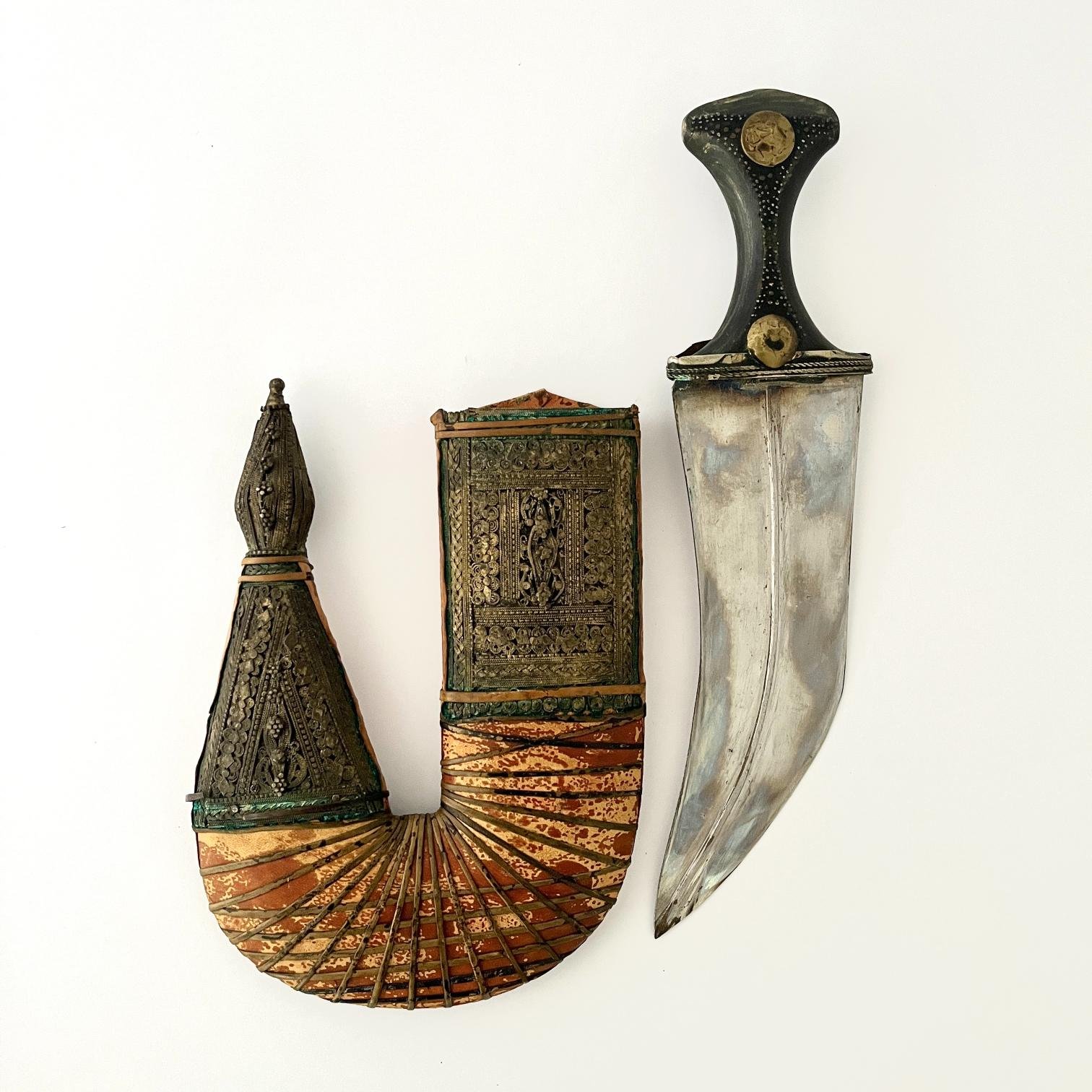 Jambiya con cabo en madera con incrustaciones y vaina en madera forrada en cuero y filigrana. Largo total 33 cm.