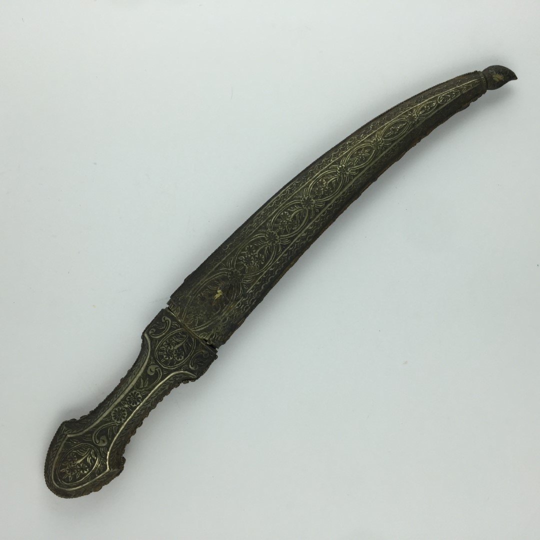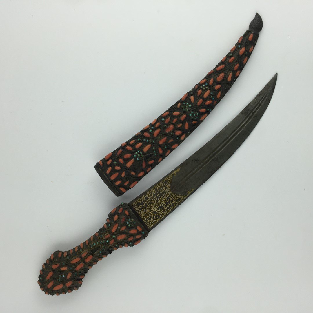 Jambiya. Hoja con incrustaciones e inscripciones en oro. Cabo y vaina en metal repujado hojas y flores, decoradas con corales y turquesas. Largo total 39 cm.