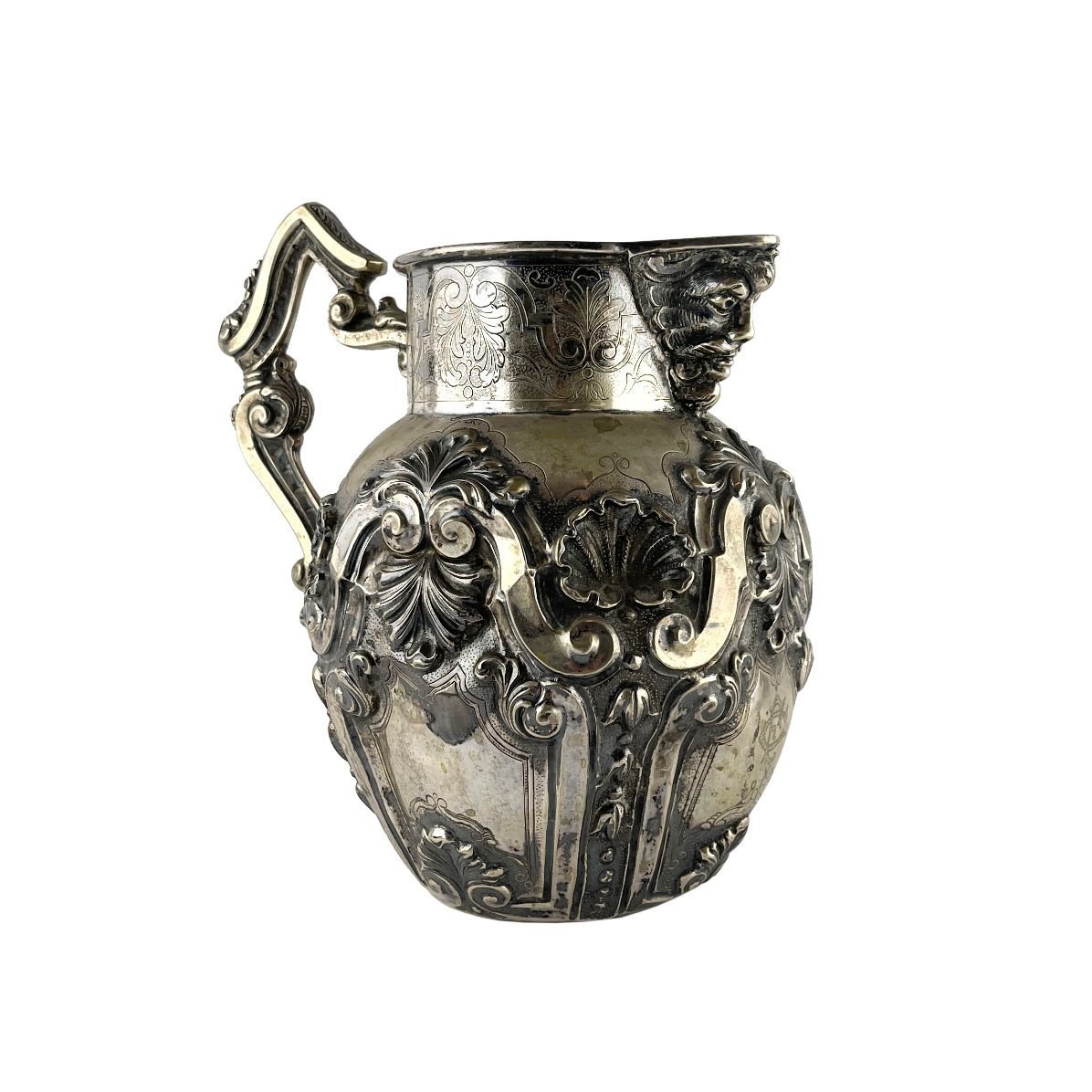 Jarra en plata cincelada y decorada «valvas», con pico esculturado «máscara», grabada con fechas e iniciales «C.E.». Alto 24 cm. Peso 1.035 gr.