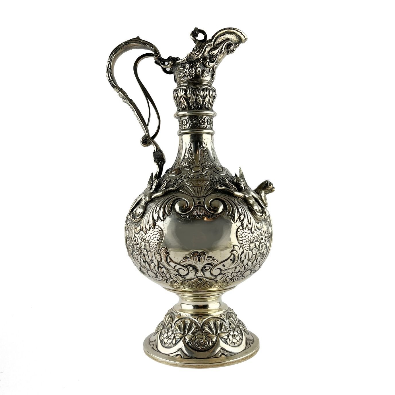 Jarra española en plata cincelada «hojas, flores y personajes mitológicos». Alto 31 cm. Peso 850 gr.