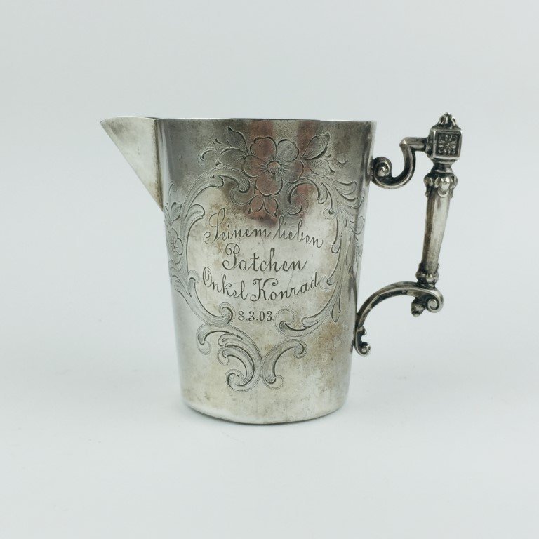 Jarrita en plata alemana cincelada «hojas y flores», con inscripción «Sienem Lieben Patchen Onkel Konrad. 8.3.02». 8.5 x 6 cm. Peso 92 gr.