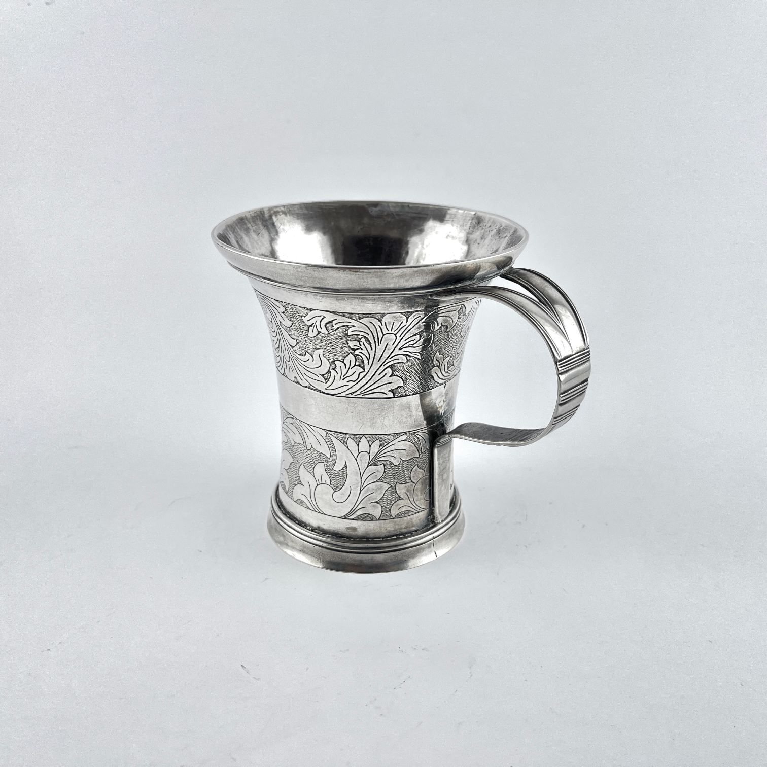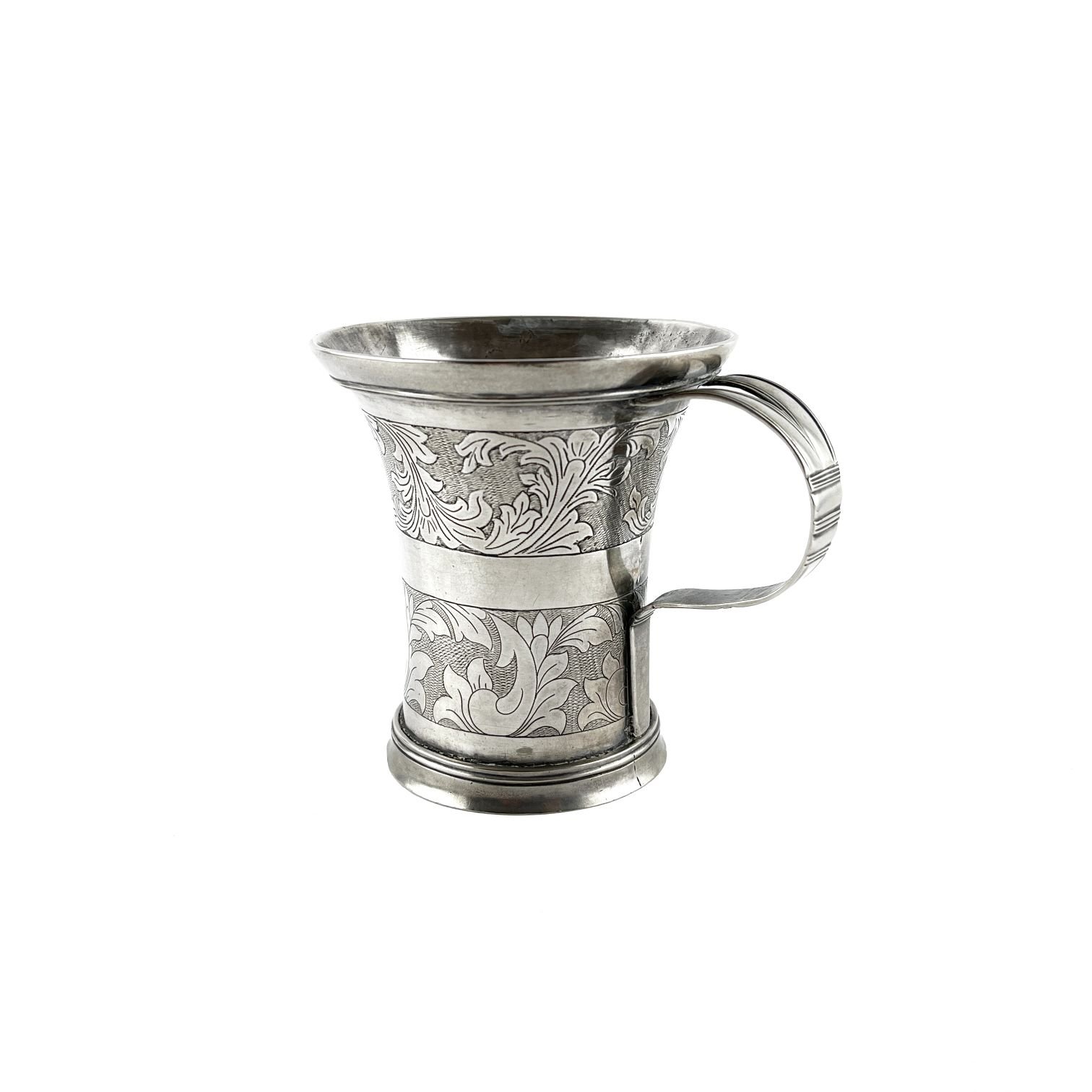 Jarro hispanoamericano s. XIX en plata batida y cincelada «hojas», con asa. 10.5 x 10.5 cm.