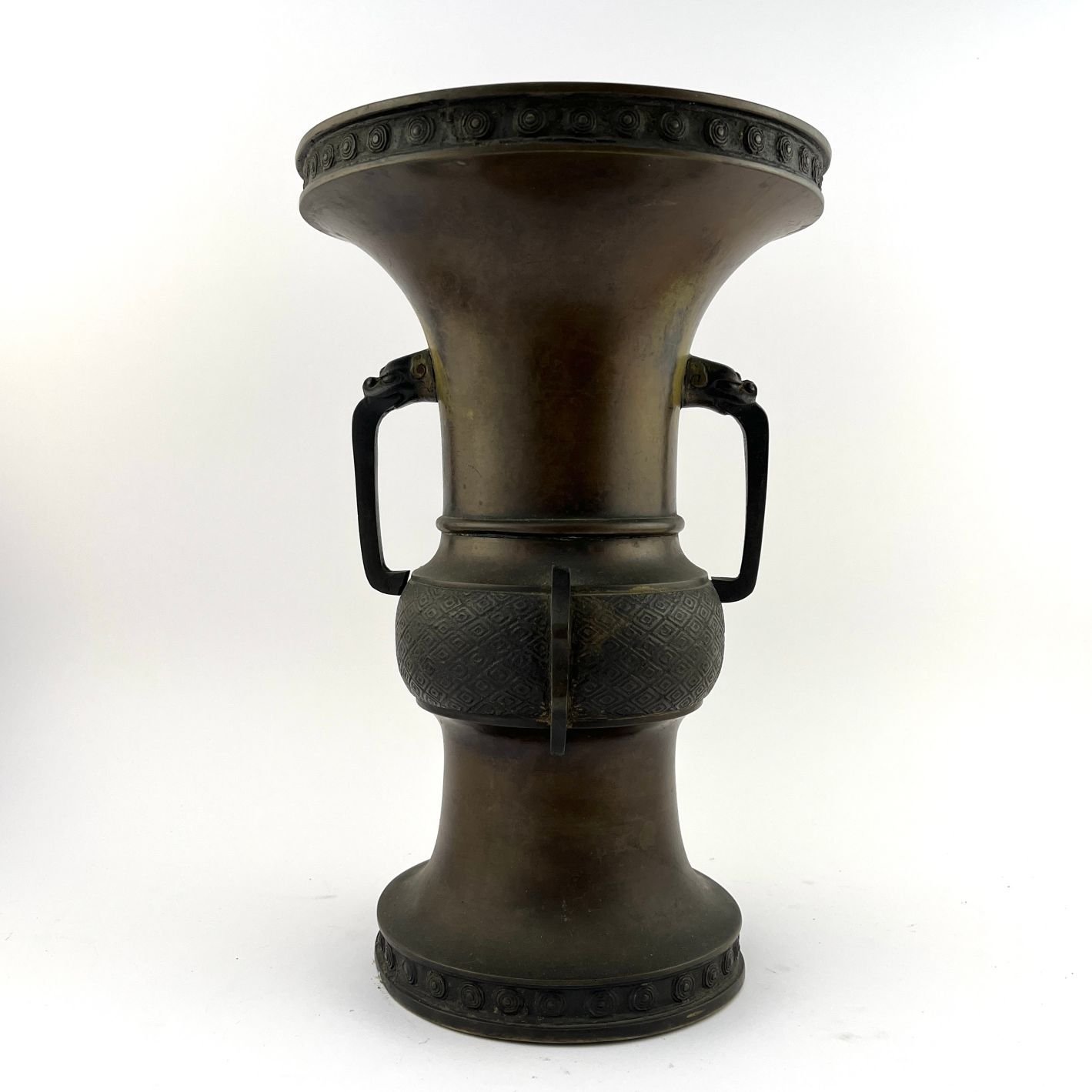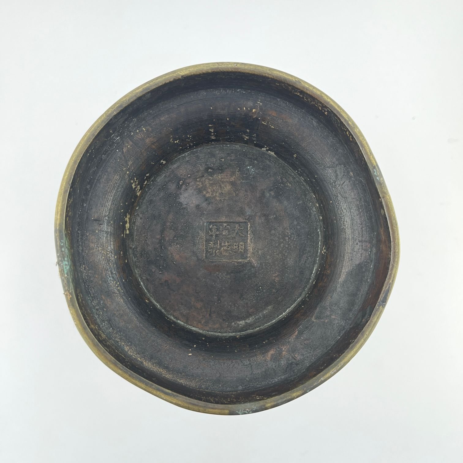 Jarrón chino en bronce cincelado en forma arcaizante, con dos asas laterales esculturadas «cabezas de qilin». Base marcada con sello relativo al período Ming. 30 x 19.5 cm. Pequeñas averías.
