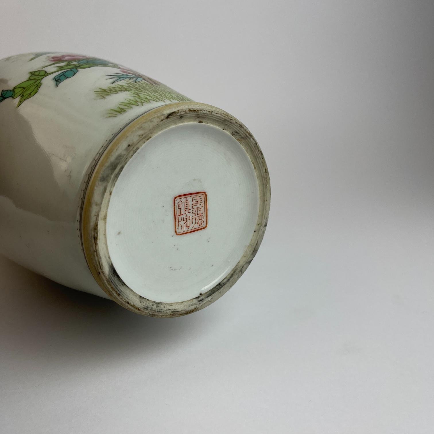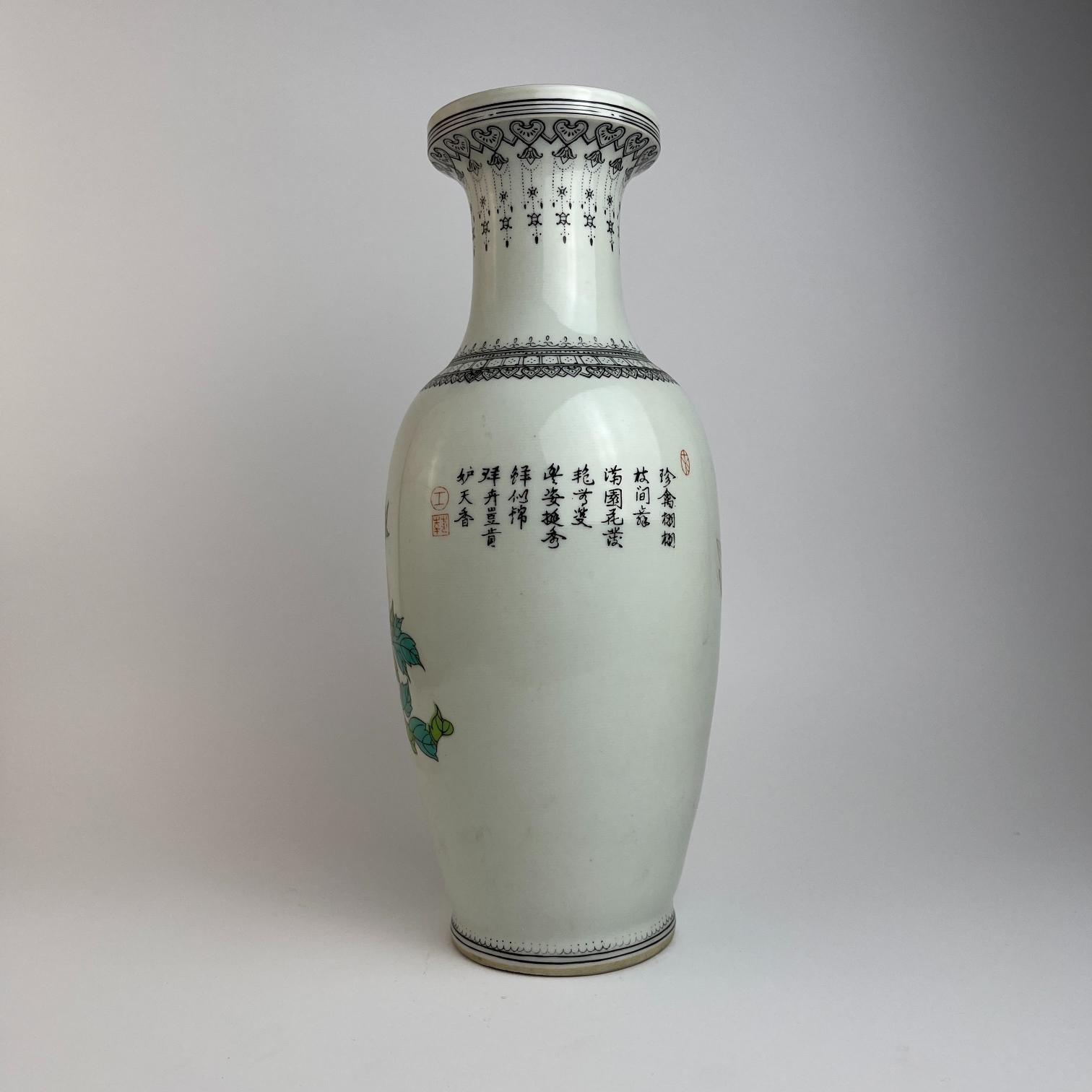 Jarron chino en porcelana decorada «aves y peonías» e inscripciones. Alto 30. Período República.