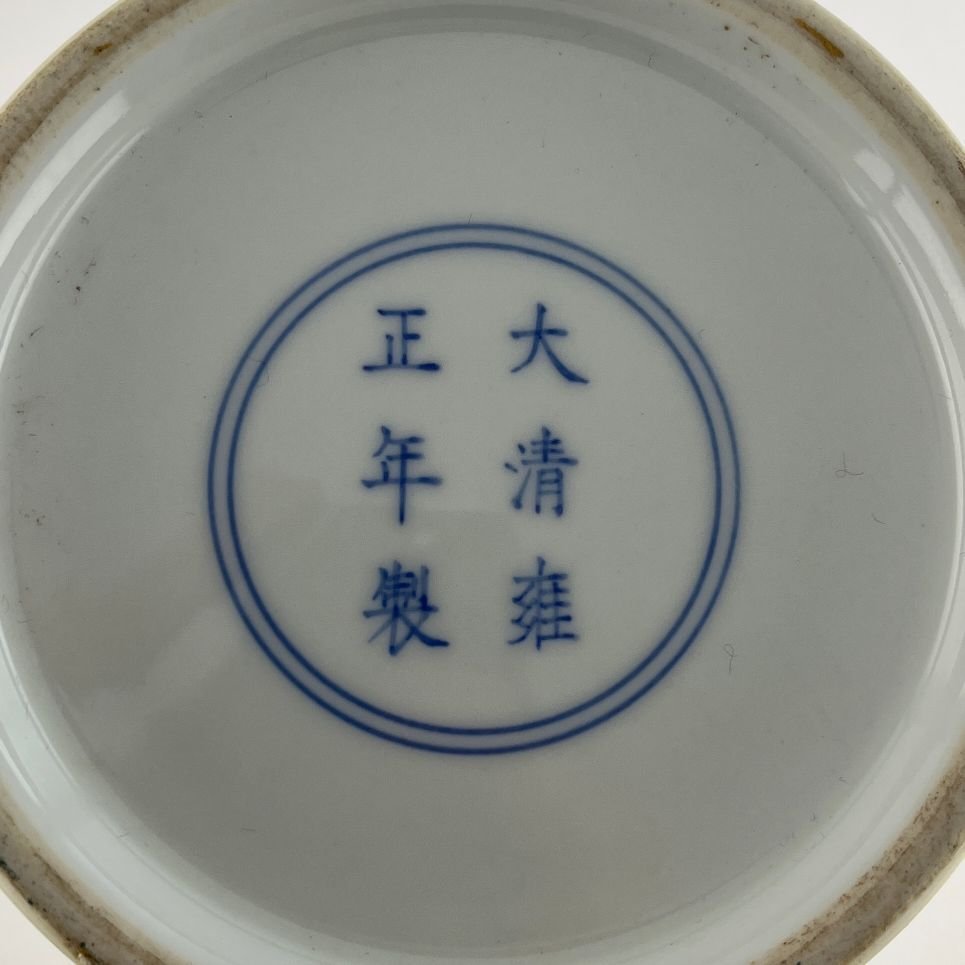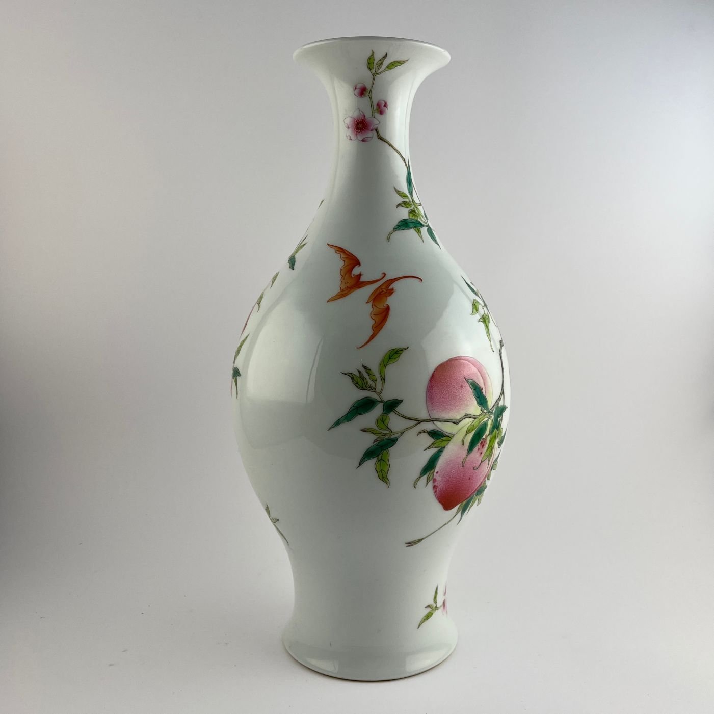 Jarrón chino en porcelana familia rosa decorado «melocotones y murciélagos». Base con doble círculo y símbolos del emperador Yongzheng. 39.5 x 19 cm.