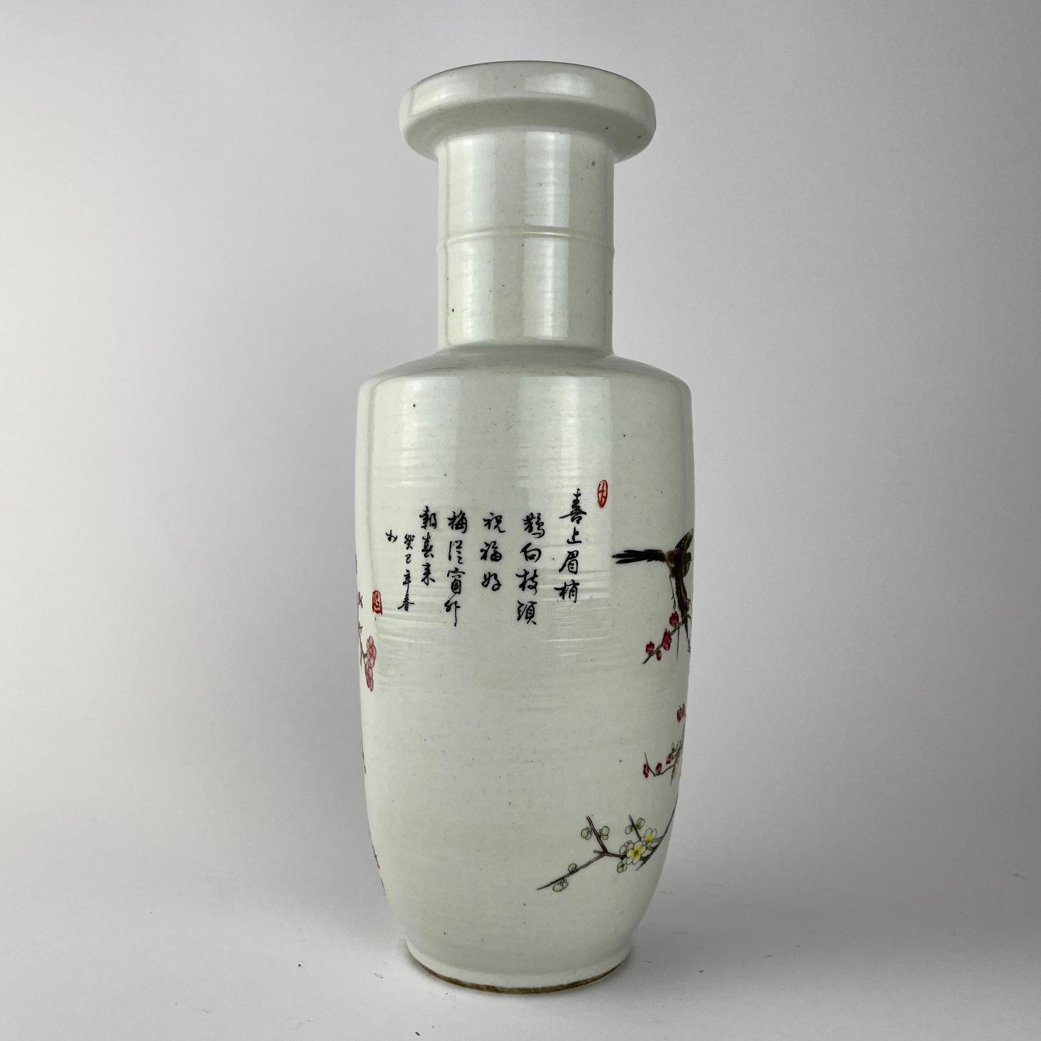Jarrón chino en porcelana familia rosa decorada «aves y cerezos», en rouleau. Base con símbolos en rojo. 27 x 11 cm.