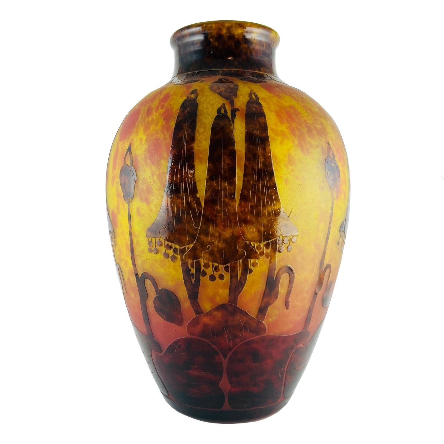 Jarrón francés en cristal Le Verre tallado «floripondios» en relieve, en color marrón sobre fondo color anaranjado y amarillo. Firmado en la base «Le Verre Français». 37 x 22 cm.