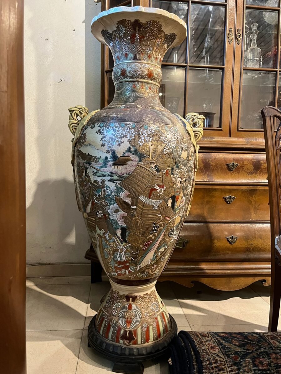 Gran jarrón japonés en cerámica Satsuma decorado «escenas típicas», con asas laterales esculturadas «dragones». 100 x 43 cm. Presentado sobre peana en madera ebanizada. Alto total 108 cm.