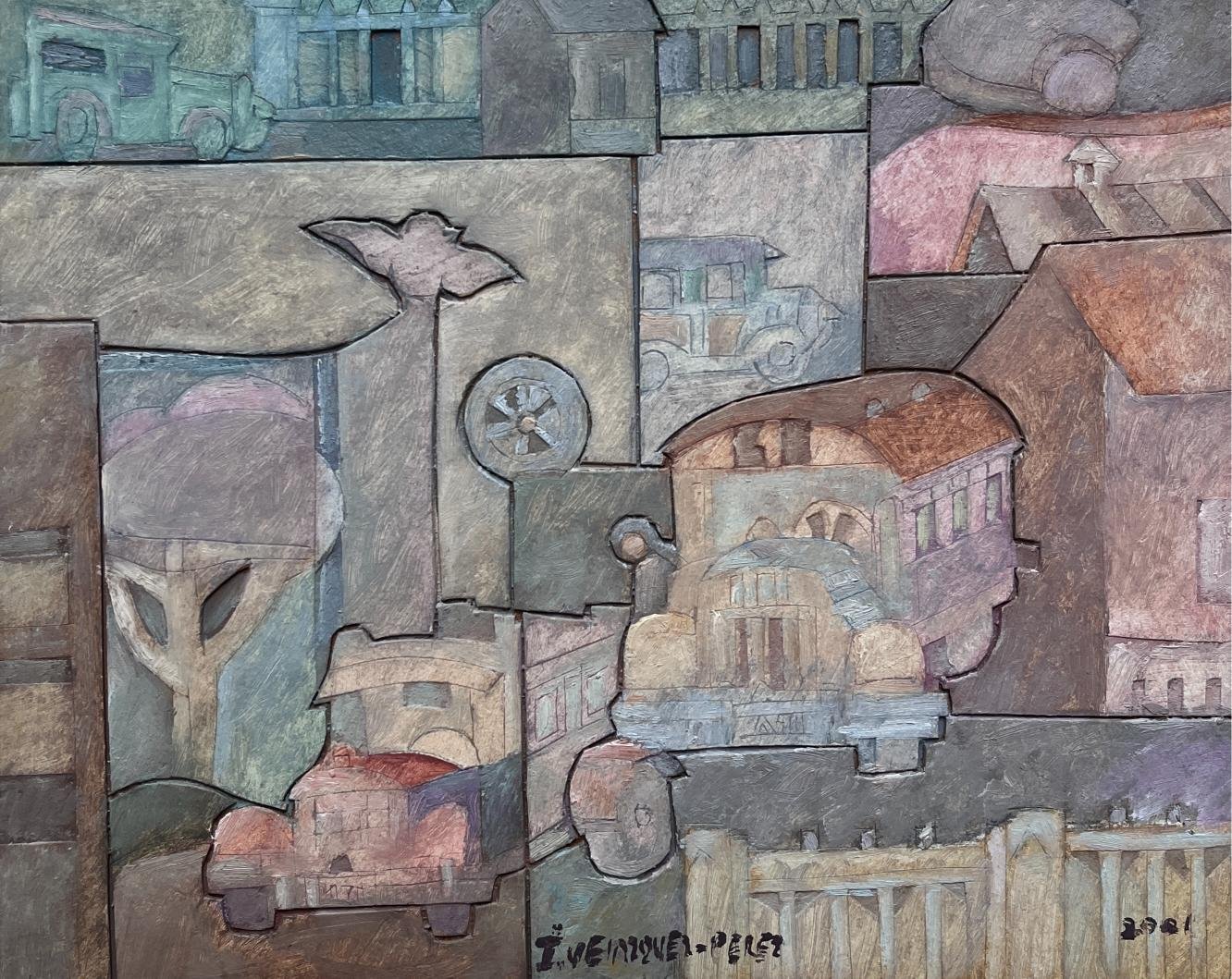 JAVIER VELÁZQUEZ PÉREZ (Escuela uruguaya, 1938) Óleo y collage sobre fibra «Escena de ciudad» Firmado abajo al centro Fechado «2001» abajo a la derecha 19,7 x 24,7 cm