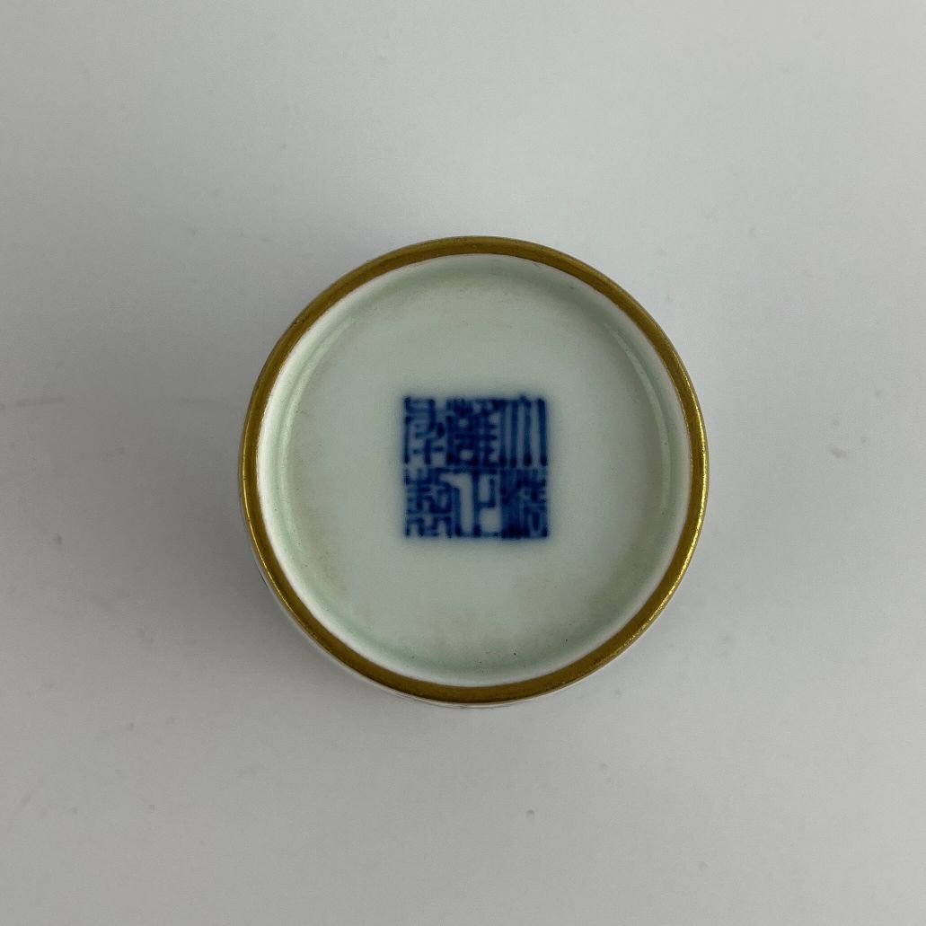 Jícara china en porcelana familia rosa decorada «flores», con destaques en dorado. Borde lobulado. Base con sello del emperador Yongzheng.