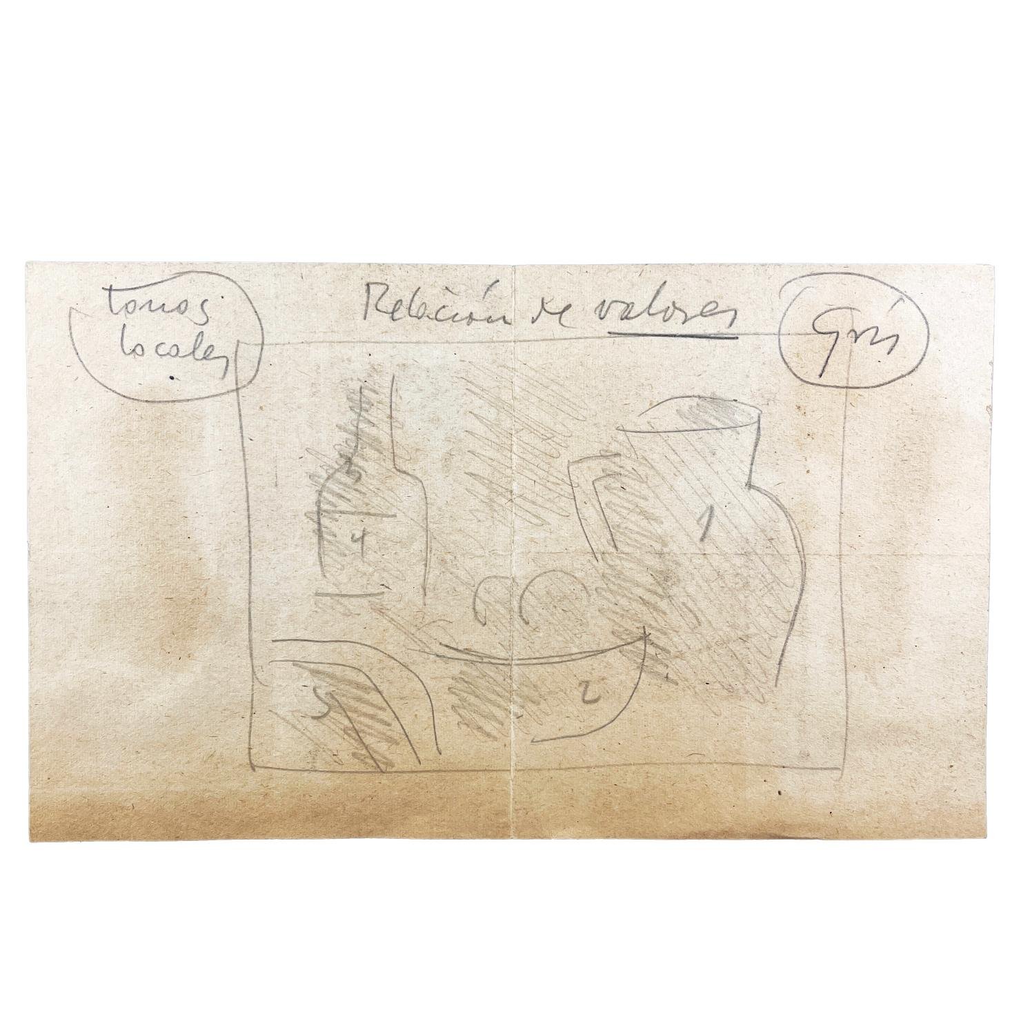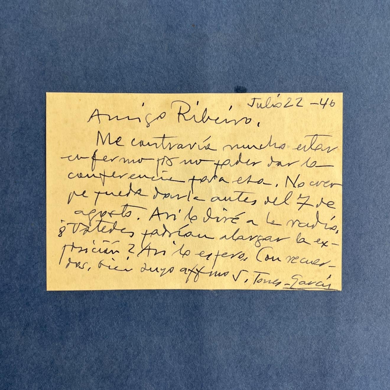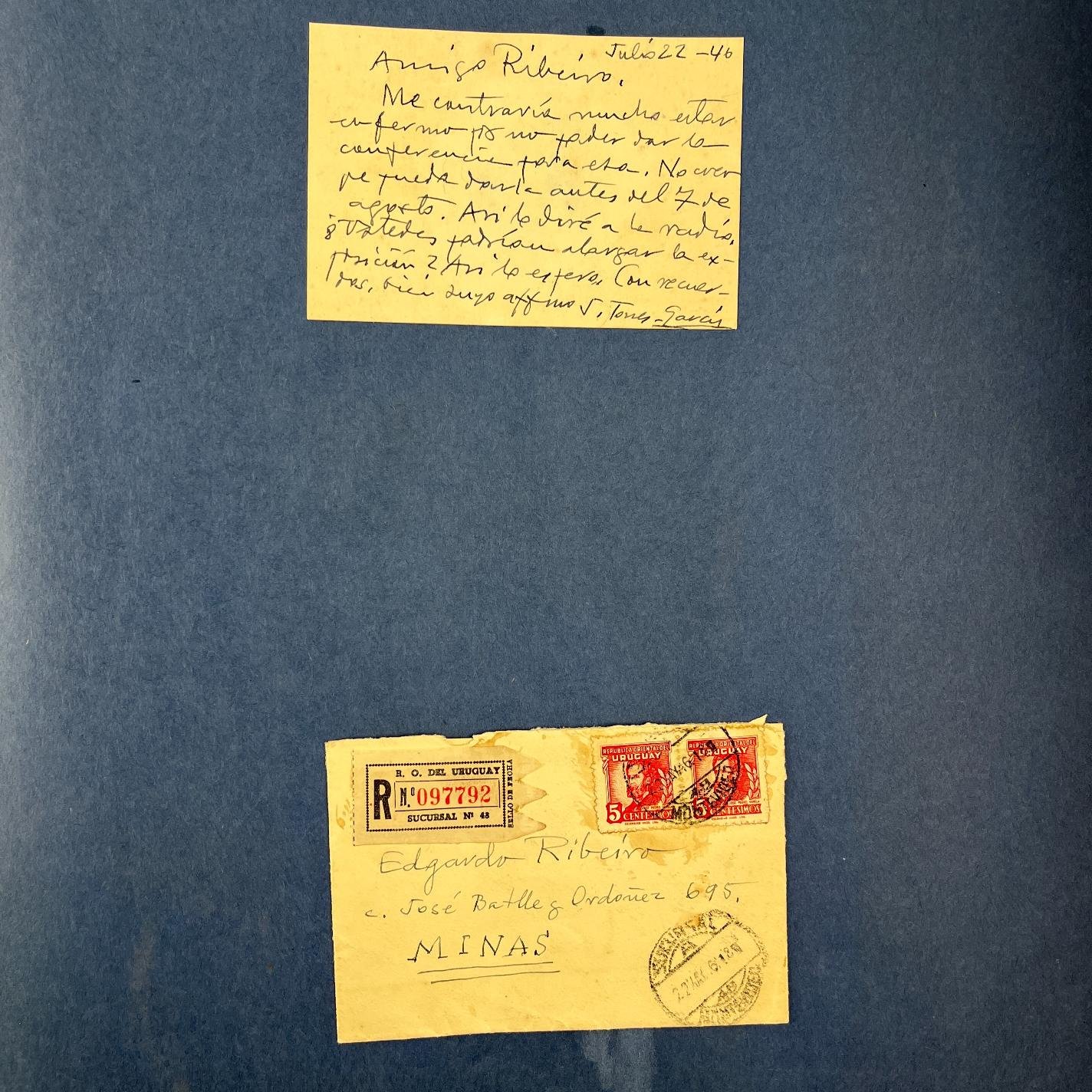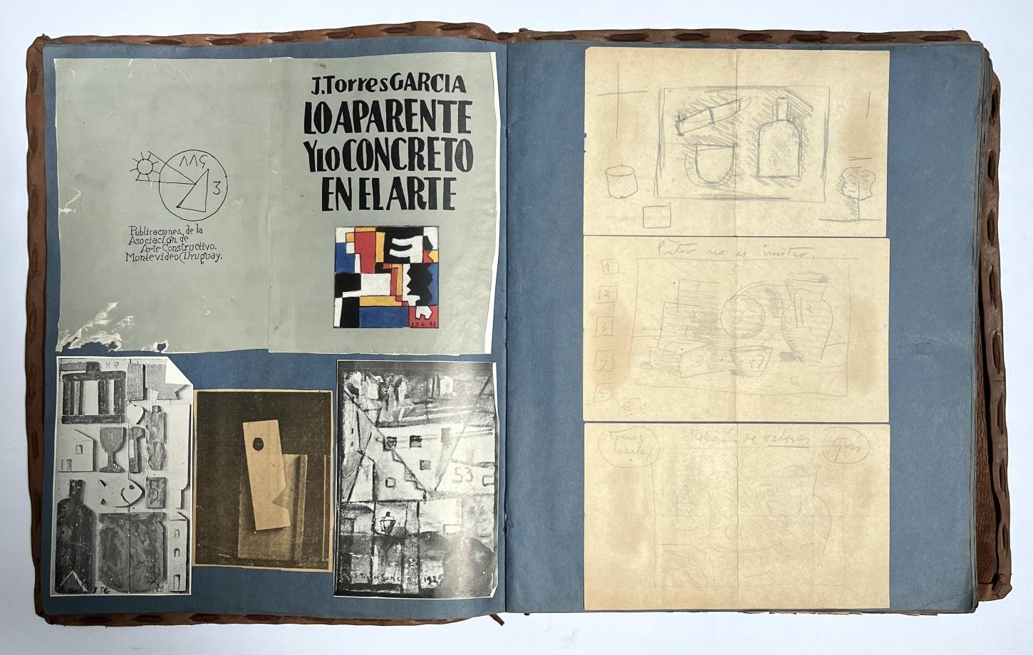 Conjunto de siete bocetos a lápiz sobre papel realizados por Joaquín Torres García (de una medida promedio de 13 x 21 cm) presentados dentro de un álbum de setenta y dos carillas, con portadas en cuero, conteniendo una amplia selección de recortes de prensa, invitaciones, folletos y láminas relativos a la actividad artística de Joaquín Torres García en la década de 1940, recopilados por el artista uruguayo Edgardo Ribeiro, alumno del maestro y miembro de su taller, incluyendo tres sobres de correspondencia enviada a Ribeiro por Torres García, dos de ellos manuscritos por Torres García, uno de ellos con membrete de la Asociación de Arte Constructivo, y una nota manuscrita por Torres García y dirigida “al amigo Ribeiro” con fecha 22 de julio de 1946. Medidas de álbum 42 x 35 cm.