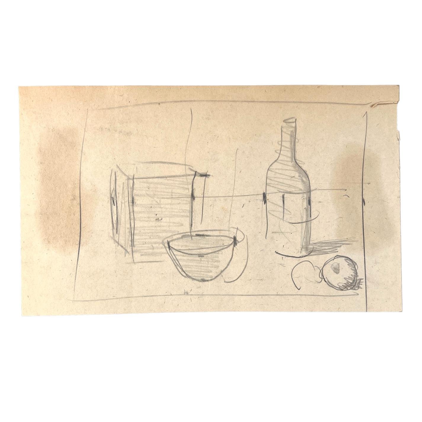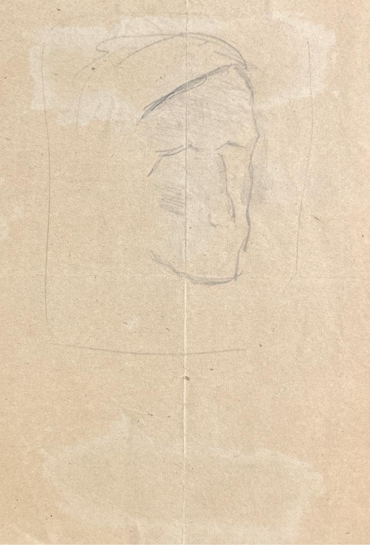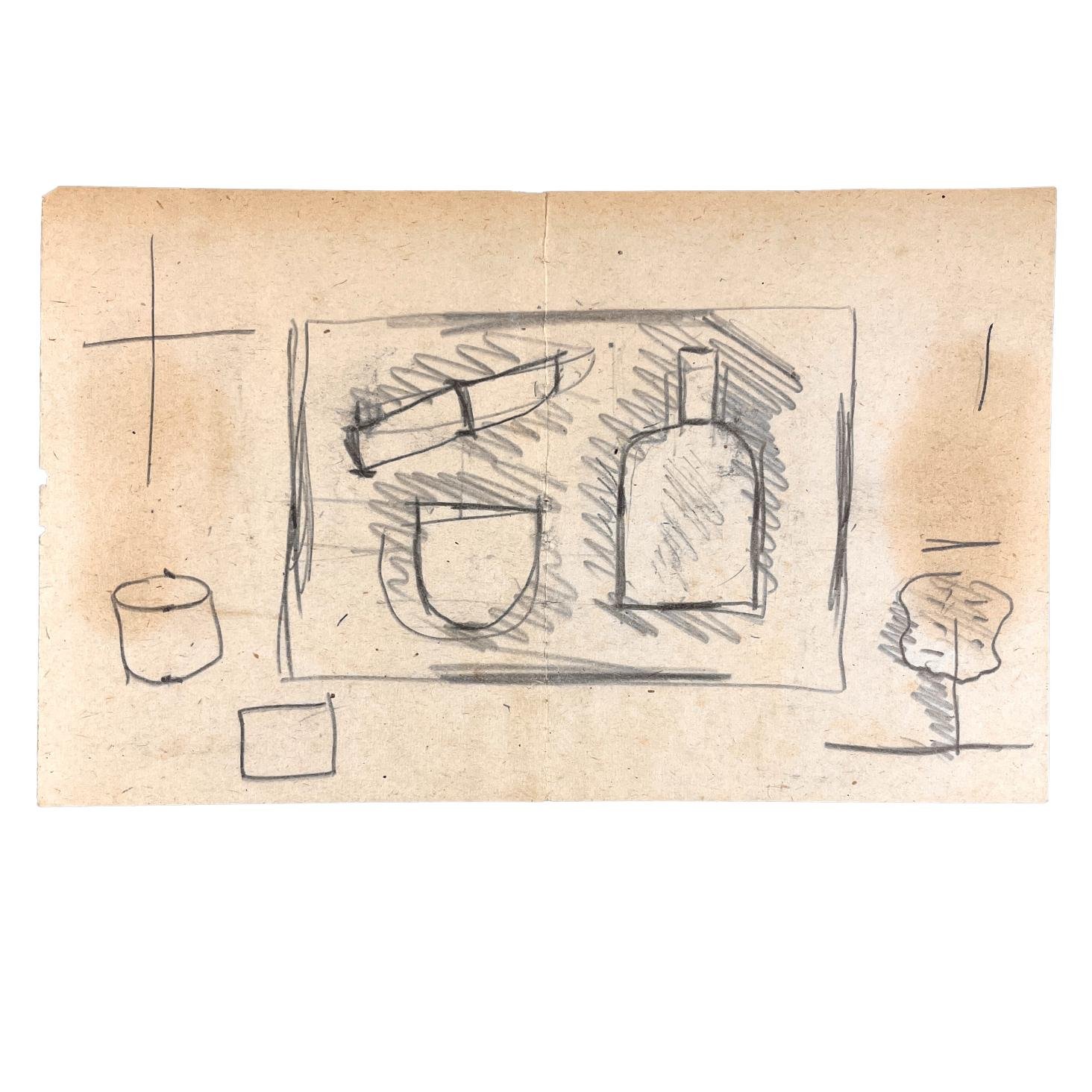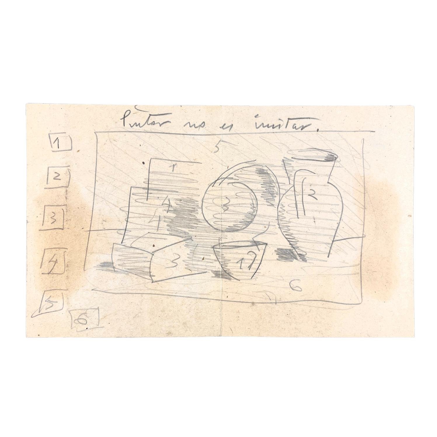 Conjunto de siete bocetos a lápiz sobre papel realizados por Joaquín Torres García (de una medida promedio de 13 x 21 cm) presentados dentro de un álbum de setenta y dos carillas, con portadas en cuero, conteniendo una amplia selección de recortes de prensa, invitaciones, folletos y láminas relativos a la actividad artística de Joaquín Torres García en la década de 1940, recopilados por el artista uruguayo Edgardo Ribeiro, alumno del maestro y miembro de su taller, incluyendo tres sobres de correspondencia enviada a Ribeiro por Torres García, dos de ellos manuscritos por Torres García, uno de ellos con membrete de la Asociación de Arte Constructivo, y una nota manuscrita por Torres García y dirigida “al amigo Ribeiro” con fecha 22 de julio de 1946. Medidas de álbum 42 x 35 cm.