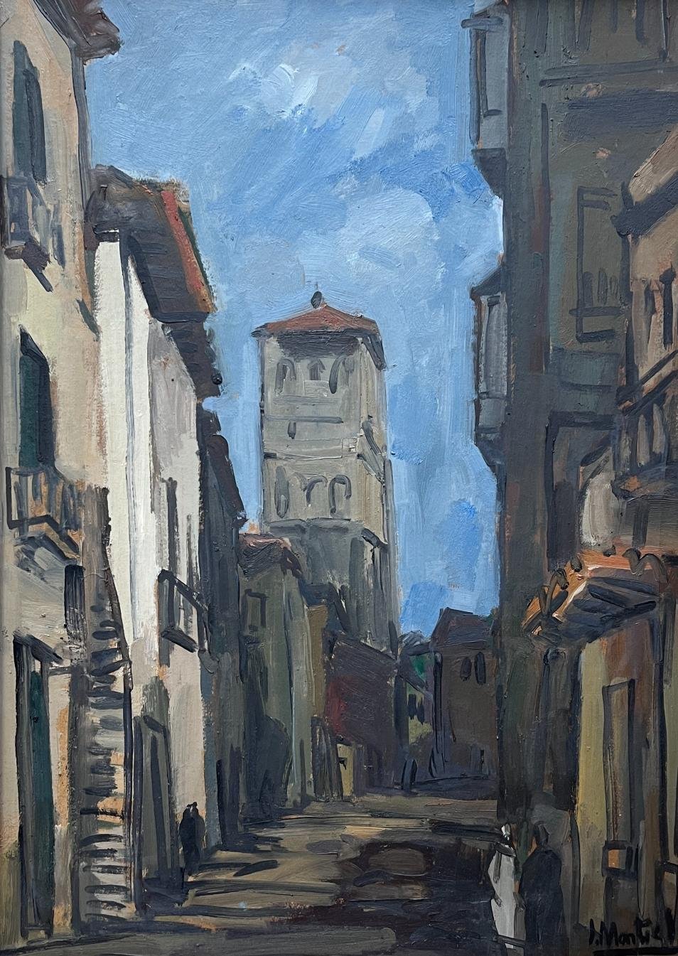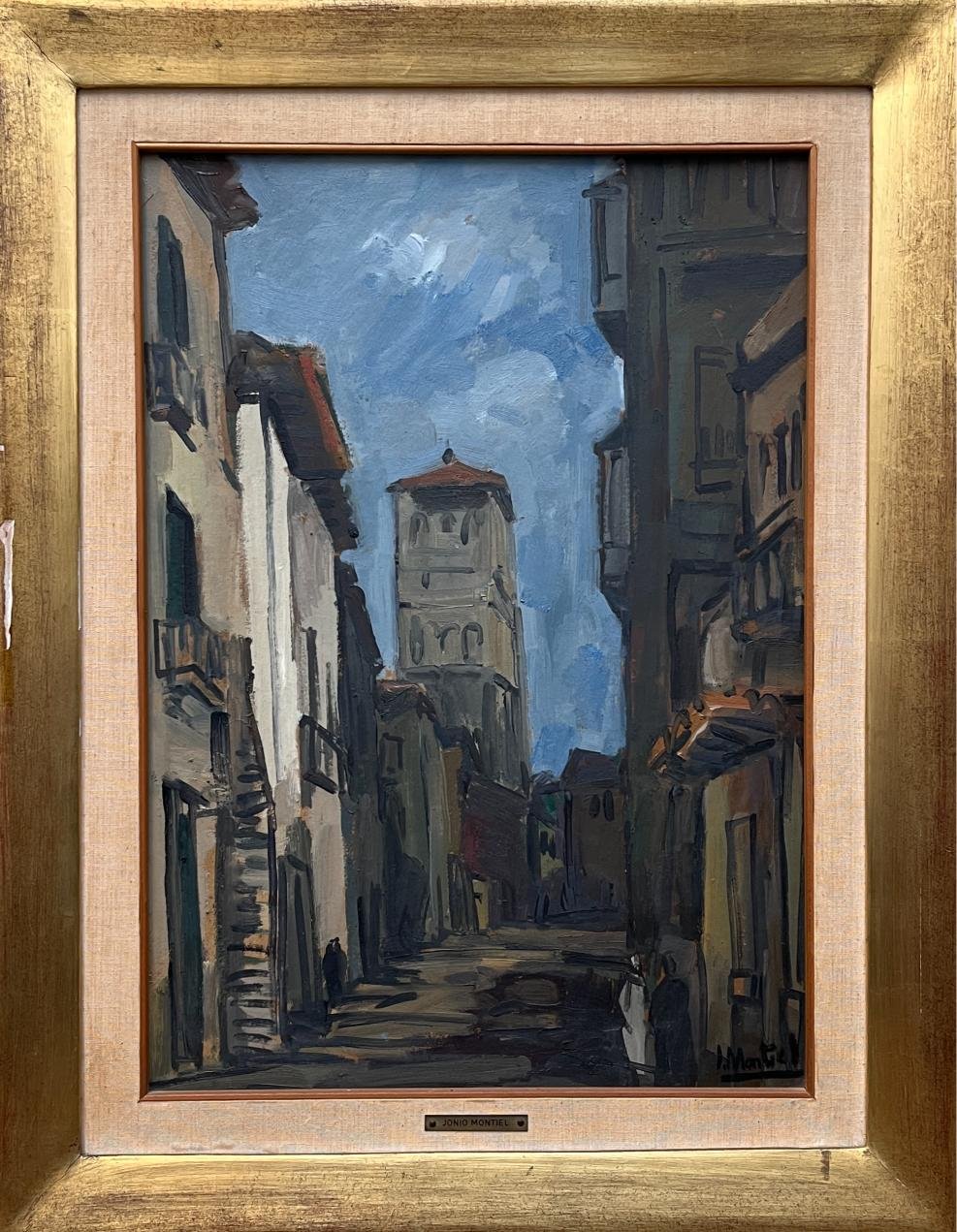 JONIO MONTIEL (Escuela uruguaya, 1924-1986) Óleo sobre cartón «Calle europea» Firmado abajo a la derecha 53 x 37 cm