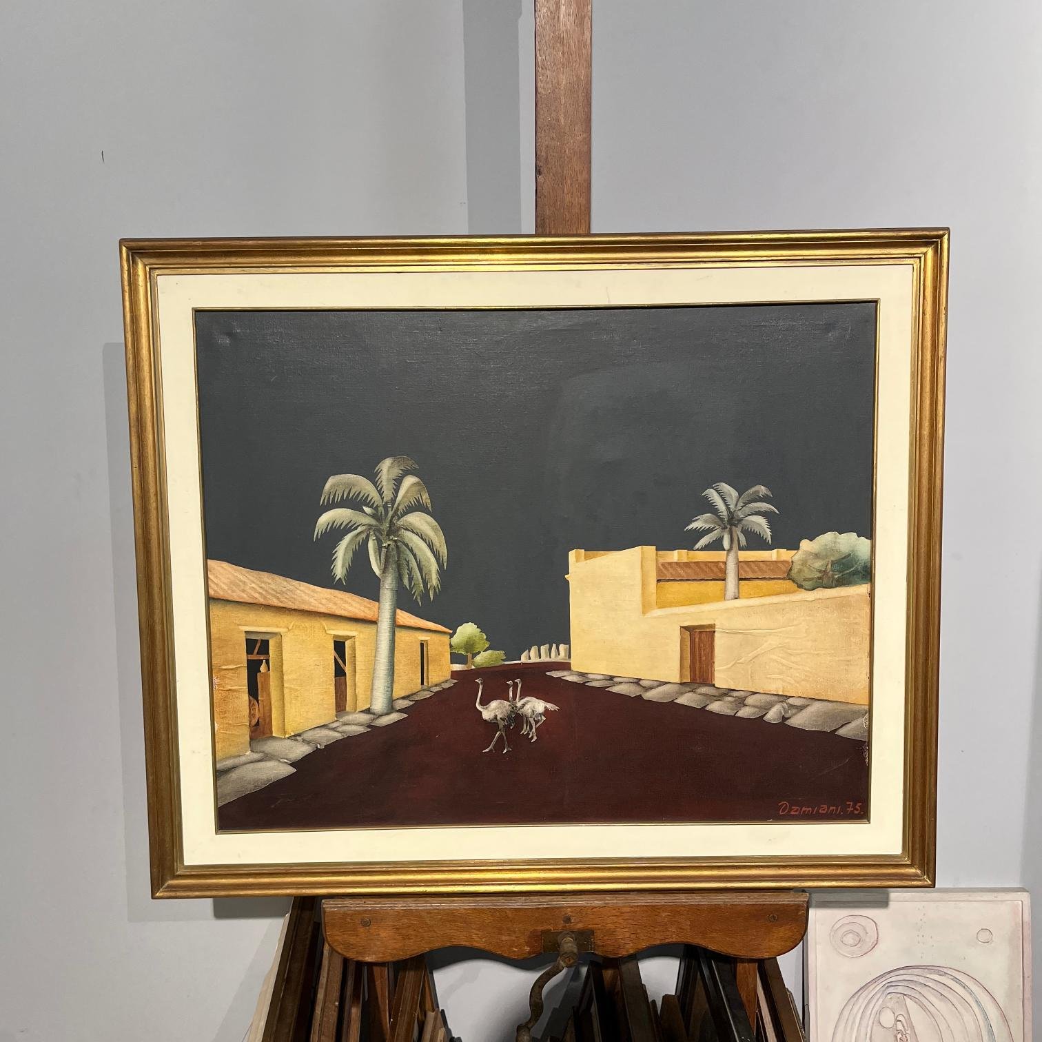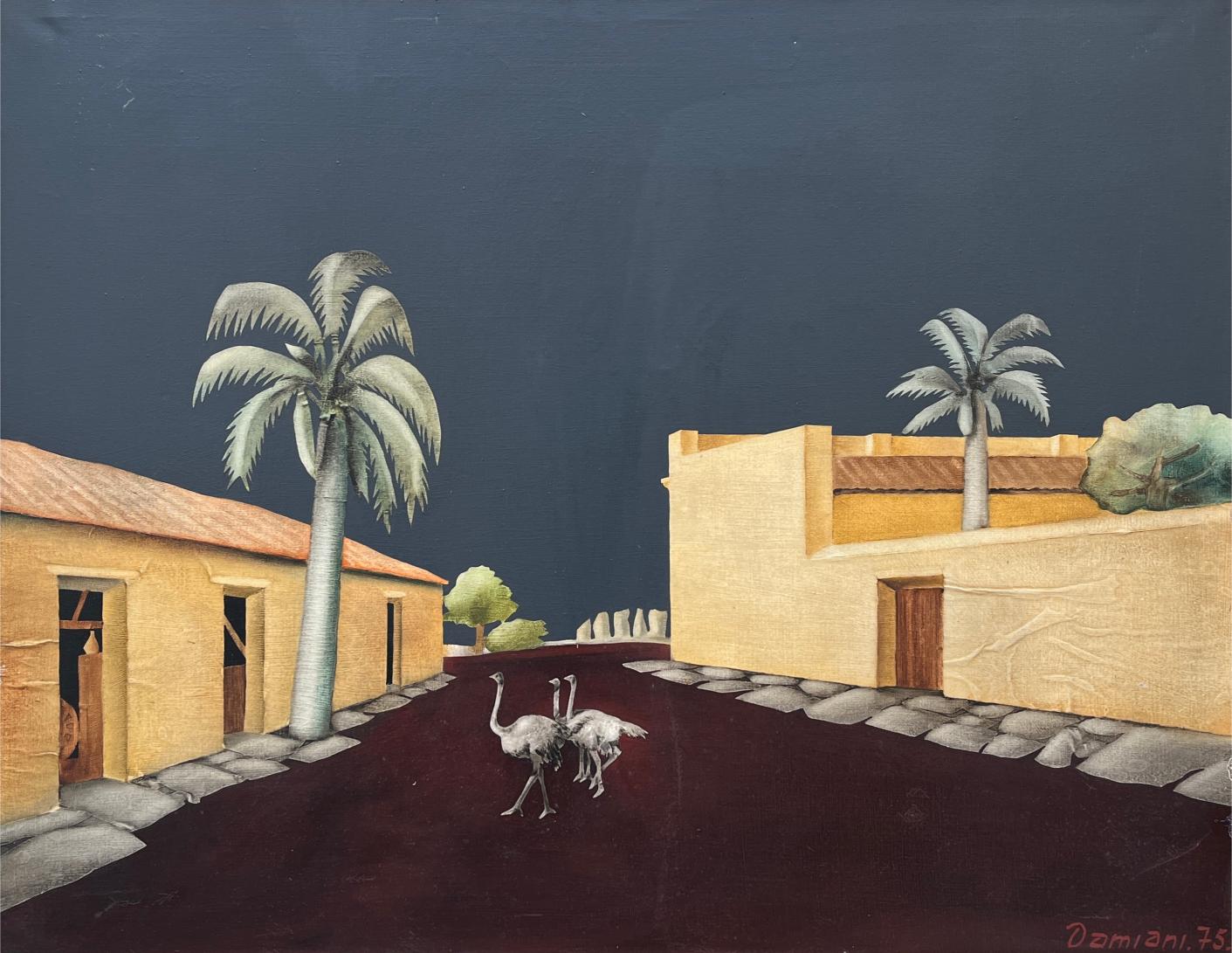 JORGE DAMIANI (Escuela uruguaya, 1931-2017) Acrílico sobre tela «Estancia con avestruces» Firmado y fechado «1975» abajo a la derecha 71 x 91 cm