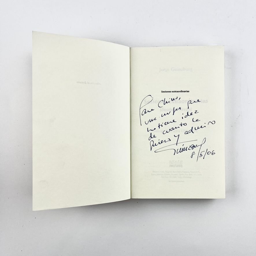 GUINZBURG, Jorge (Argentina, 1949-2008). «Sesiones extraordinarias (desde el diván).» Buenos Aires, 2006. Grupo Norma. 359 p. Ejemplar autografiado y dedicado por el autor. «Para China, una mujer que no tiene idea de cuánto la quiero y la admiro.»