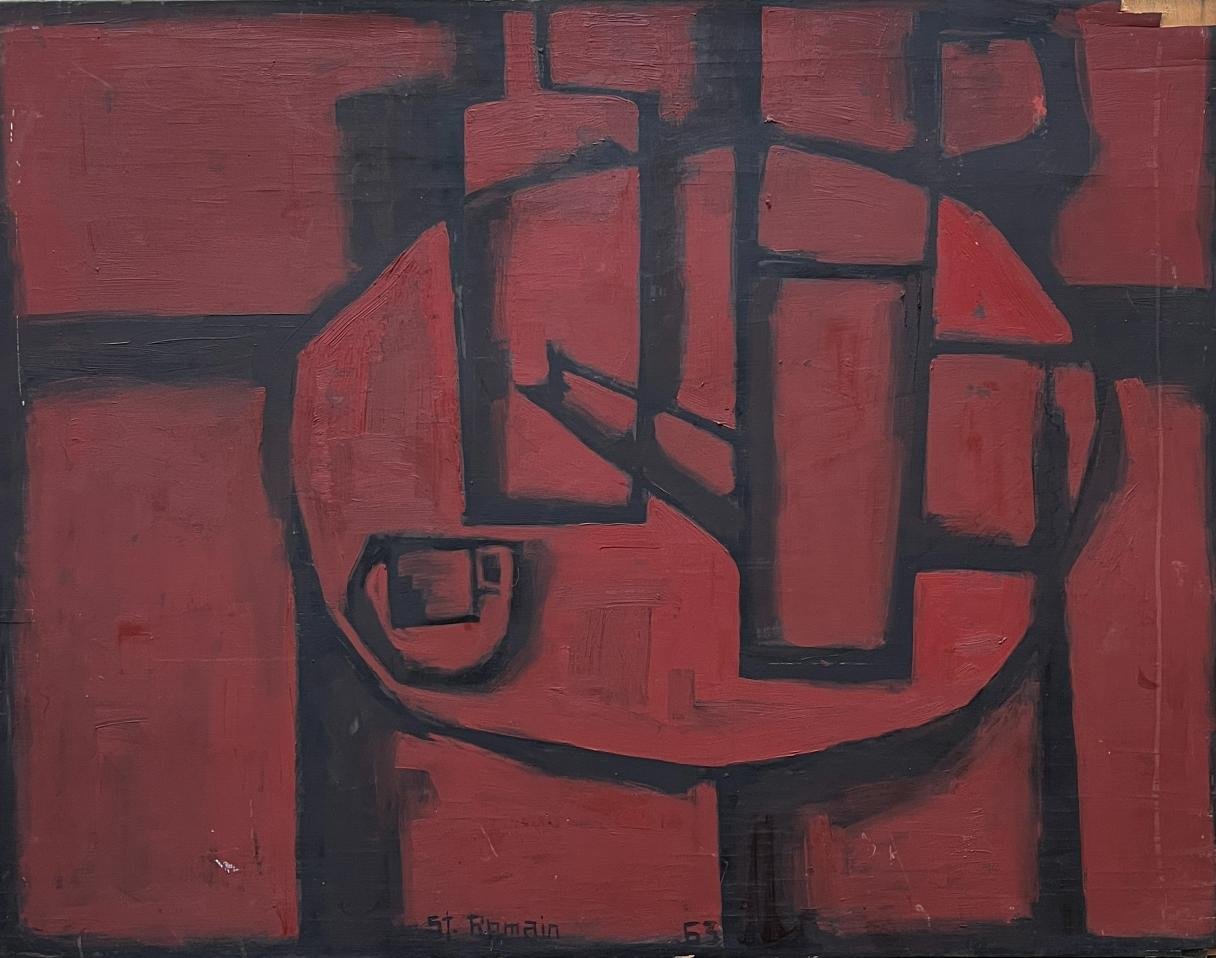 JOSÉ ALBERTO SAINT ROMAIN (Escuela uruguaya, 1909-1976) Óleo sobre madera «Constructivo» Firmado y fechado «63» abajo al centro 70 x 90 cm Presenta averías y faltantes