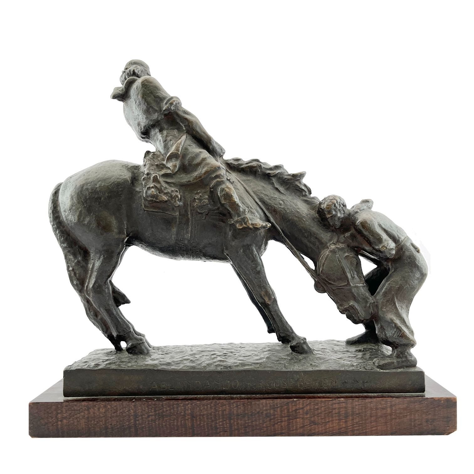 JOSÉ BELLONI (1882-1965). Escultura en bronce pátina oscura. «Ablandando.» Firmado en la base. 30 x 30 x 9 cm. Presentado sobre peana en madera. Alto total 32.5 cm.