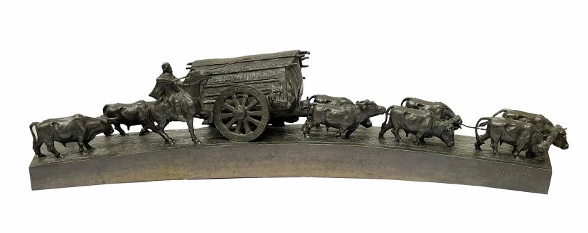 JOSÉ BELLONI (escuela uruguaya, 1882-1965). Escultura en bronce pátina oscura. «La carreta.» Versión curva. Firmada en la base. Largo 105 cm. Con dedicatoria grabada al frente.
