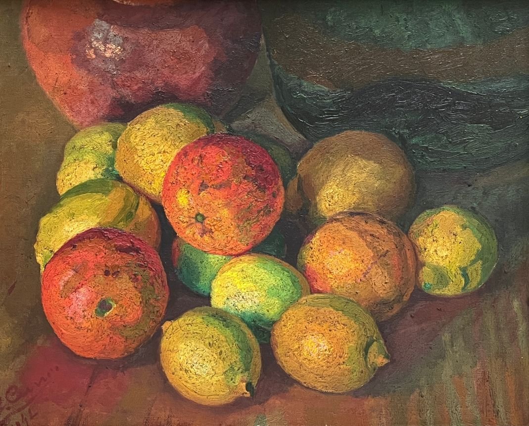 JOSÉ CUNEO (1887-1977) Óleo sobre cartón «Naturaleza muerta con naranjas y limones» Firmado y fechado «1942» abajo a la izquierda 40 x 50 cm Certificado con fecha “23/VIII/1991”