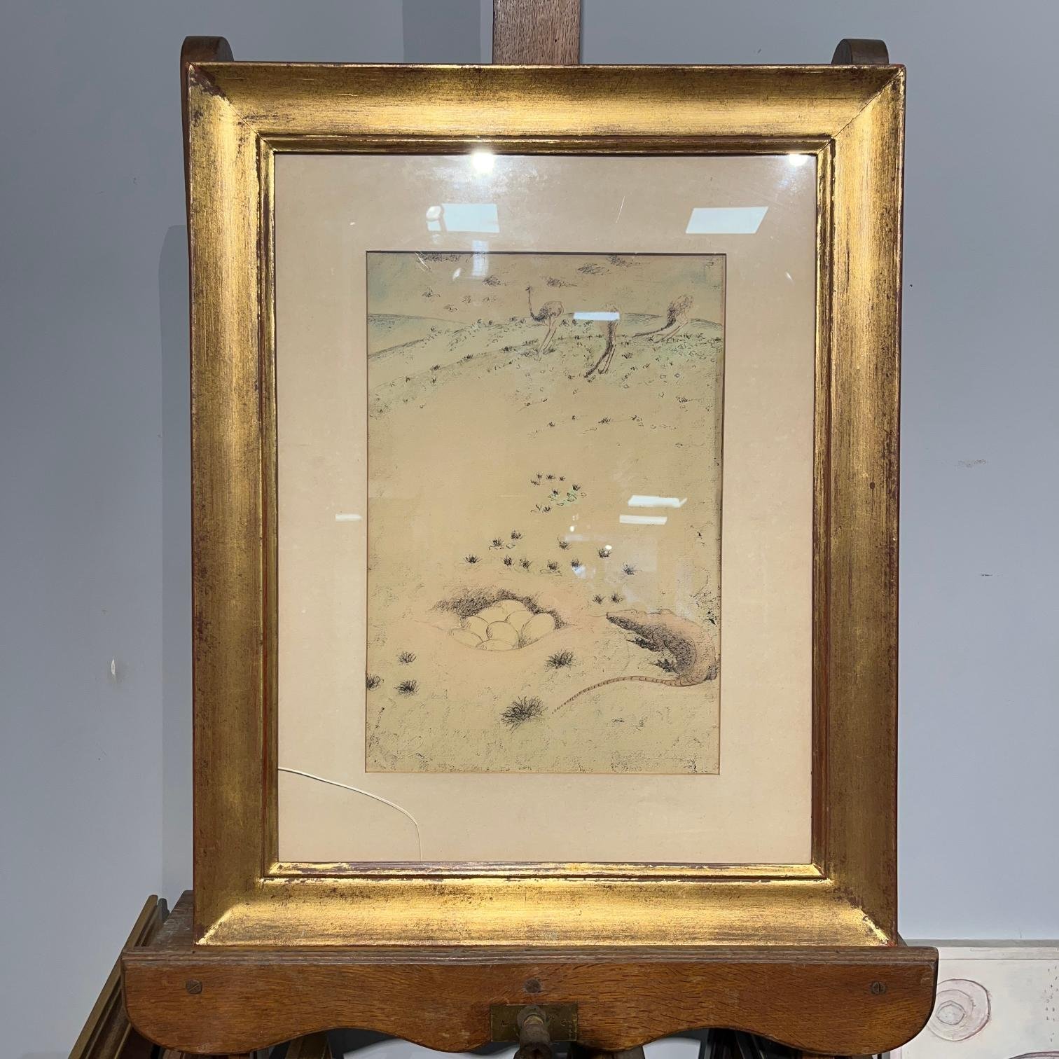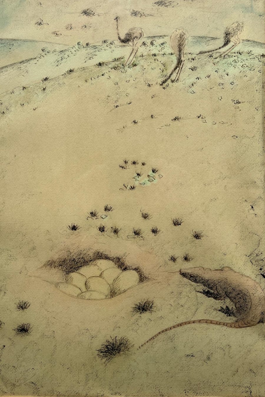 JOSÉ CUNEO (Escuela uruguaya, 1887-1977) Tinta china y acuarela sobre cartón «Ñandúes y lagarto» Firma poco legible abajo a la izquierda 30 x 44 cm