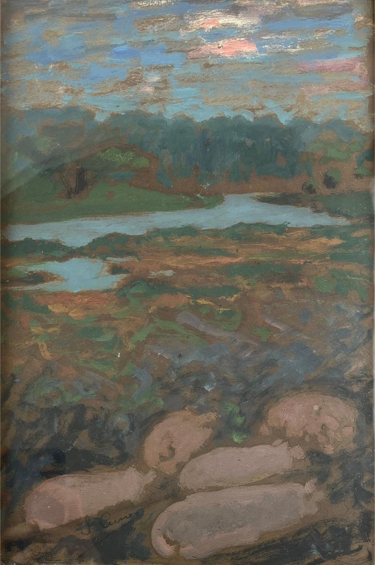 JOSÉ CUNEO (Escuela uruguaya, 1887-1977) Óleo sobre cartón «Nocturno en el campo con vacas» Firmado abajo a la izquierda 34 x 23 cm