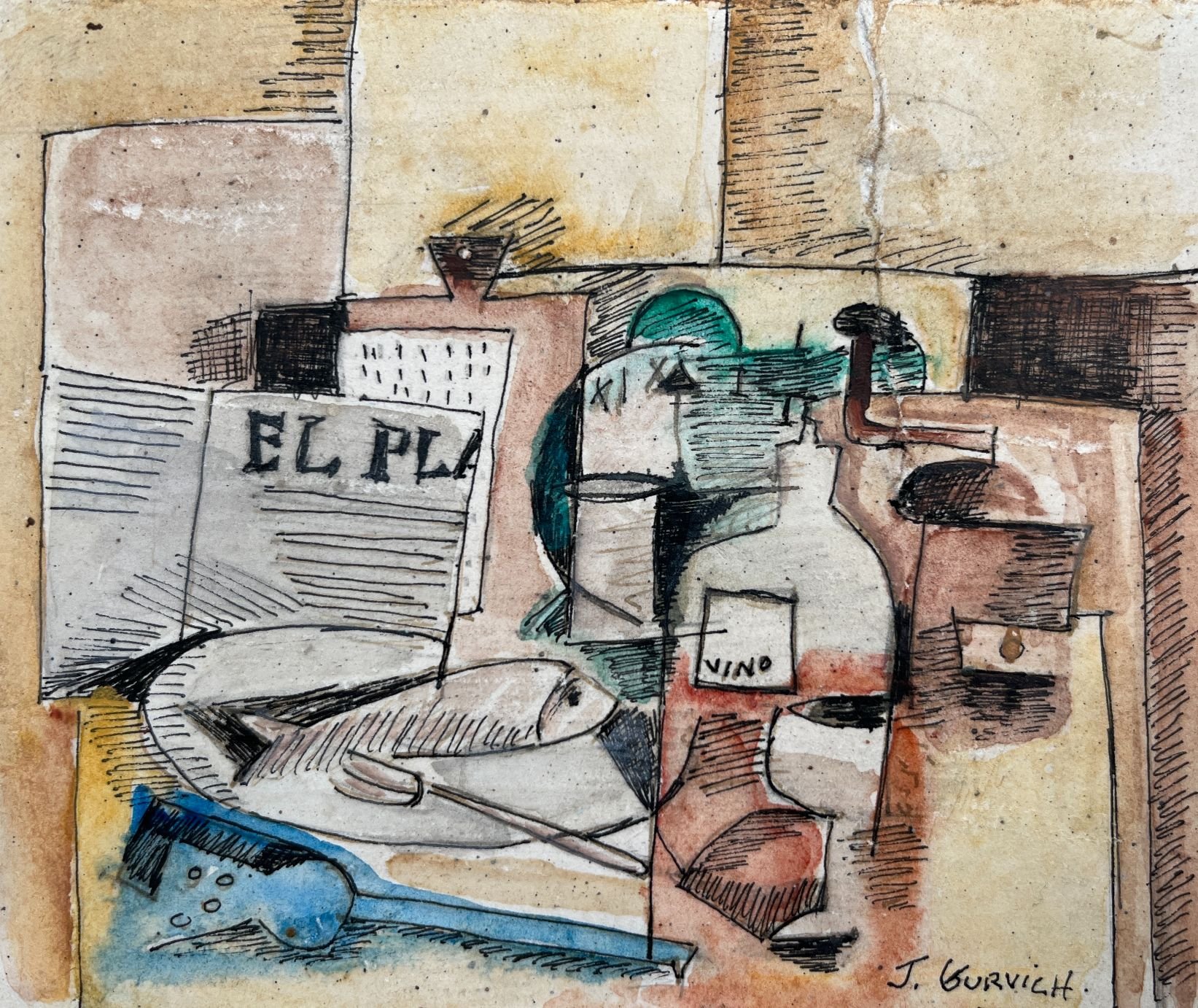«Naturaleza muerta con pez, vino y periódico»