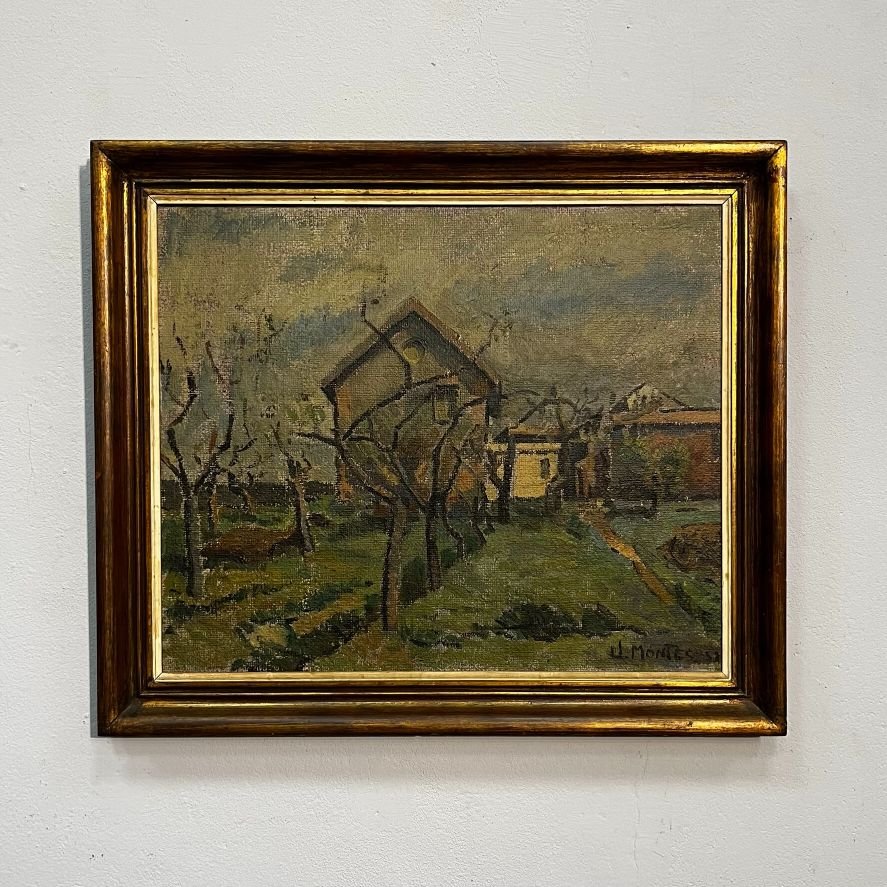 MONTES, José «Pepe» (escuela uruguaya, 1929-1997). Óleo sobre tela. «Caserío.» Firmado y fechado «52» abajo a la derecha.