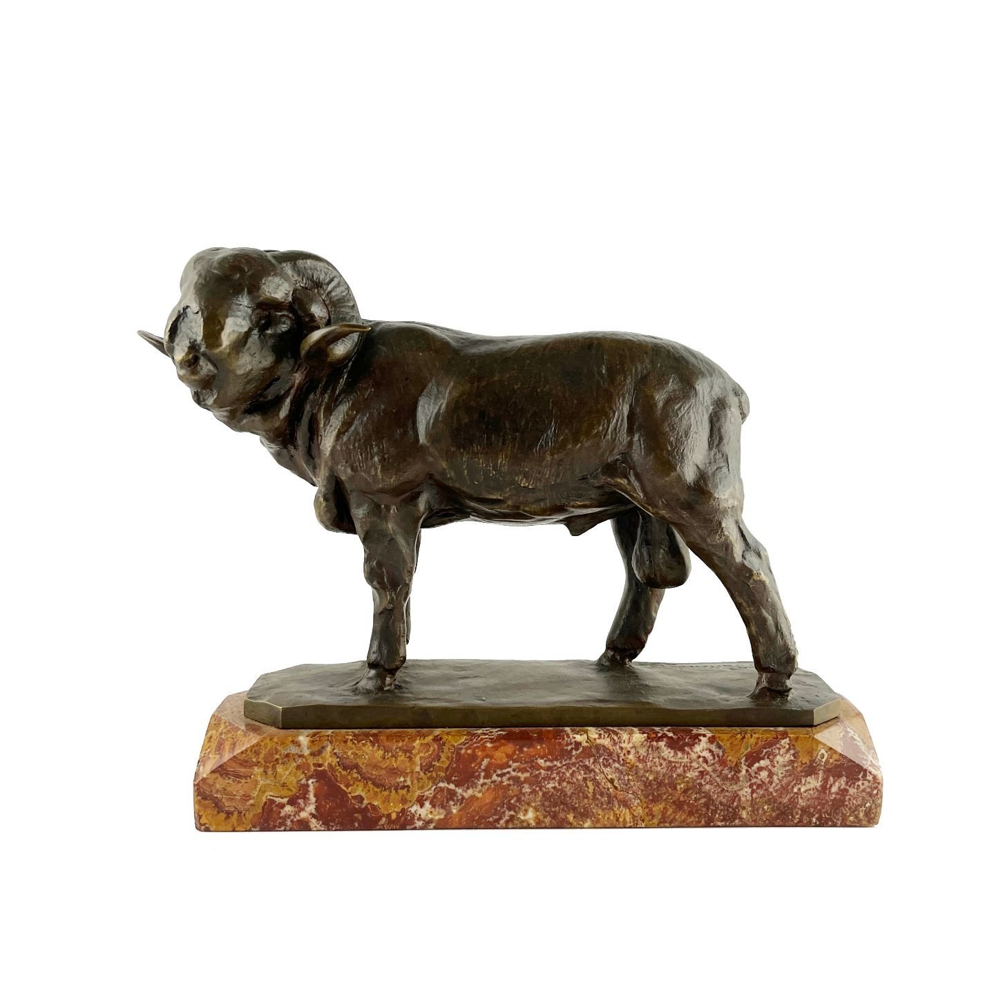 JOSEPH FRANZ PALLENBERG (escuela alemana, 1882-1945). Escultura en bronce pátina marrón. «Carnero.» Firmada en la base. 17 x 21 x 5.5 cm. Presentada sobre peana en mármol. Alto total 20 cm.