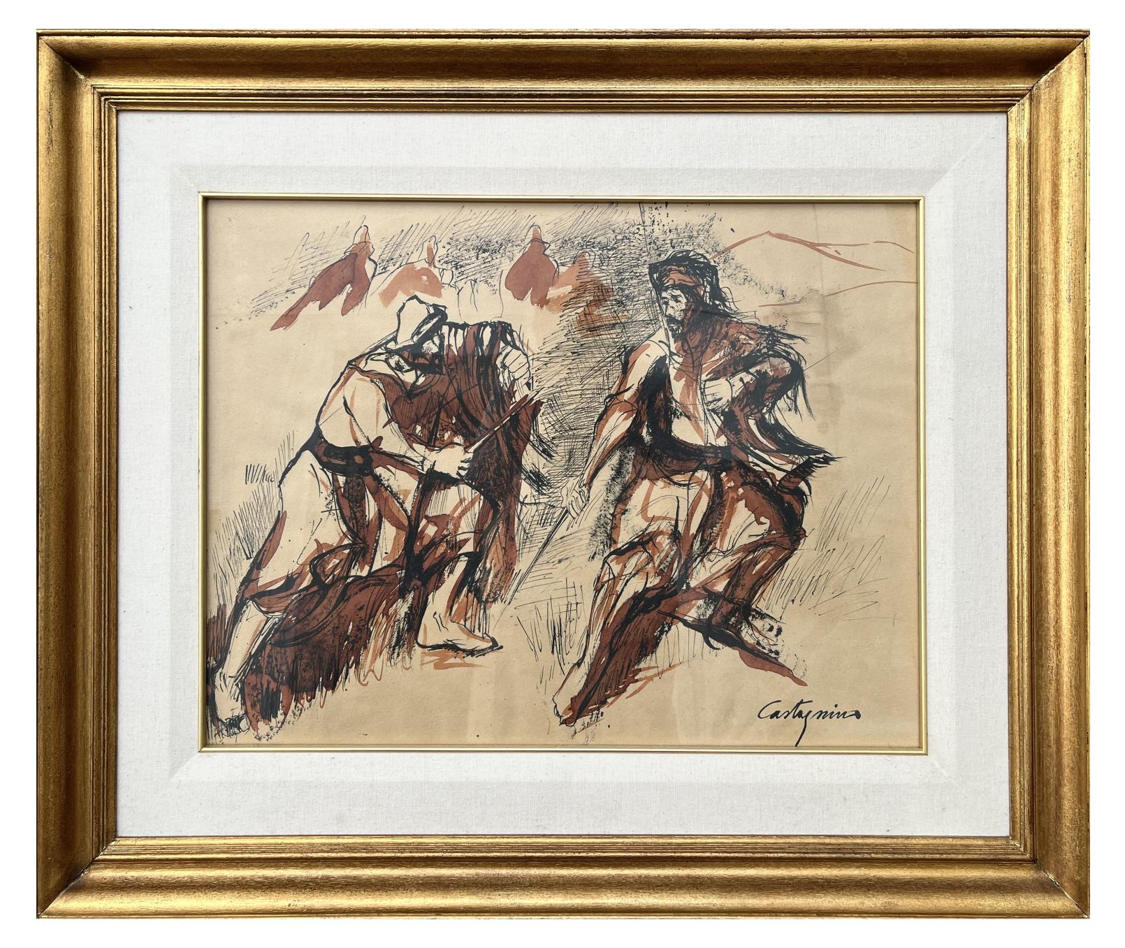 JUAN CARLOS CASTAGNINO (escuela argentina, 1908-1972). Tinta y acuarela sobre papel. «Combate gaucho.» Firmado abajo a la derecha. 45 x 60 cm.