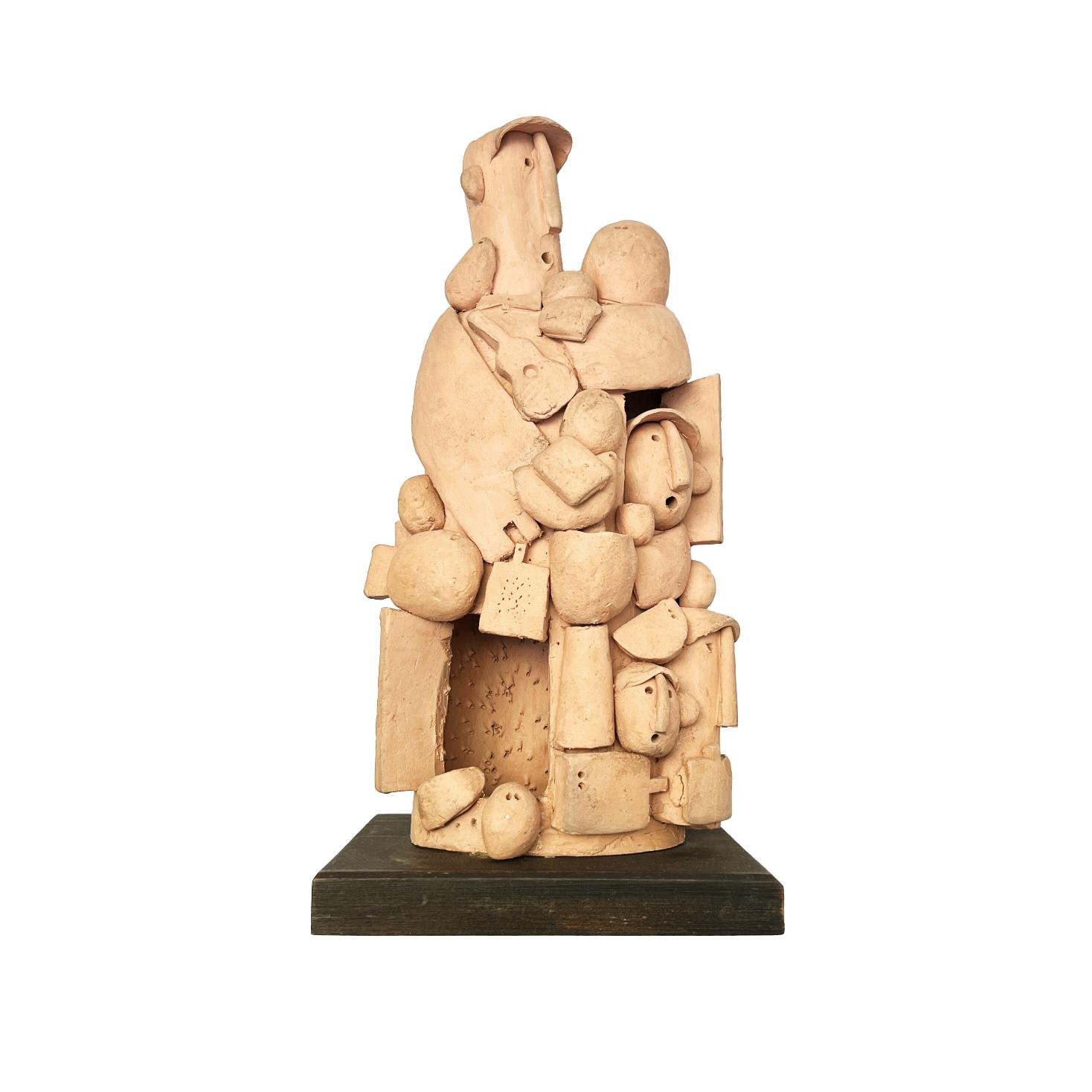 JUAN CAVO (Escuela uruguaya, 1932-1994) Escultura en cerámica «Personajes» 28 x 13 x 9 cm Firmada atrás arriba Presentada sobre base en madera Alto total 30 cm