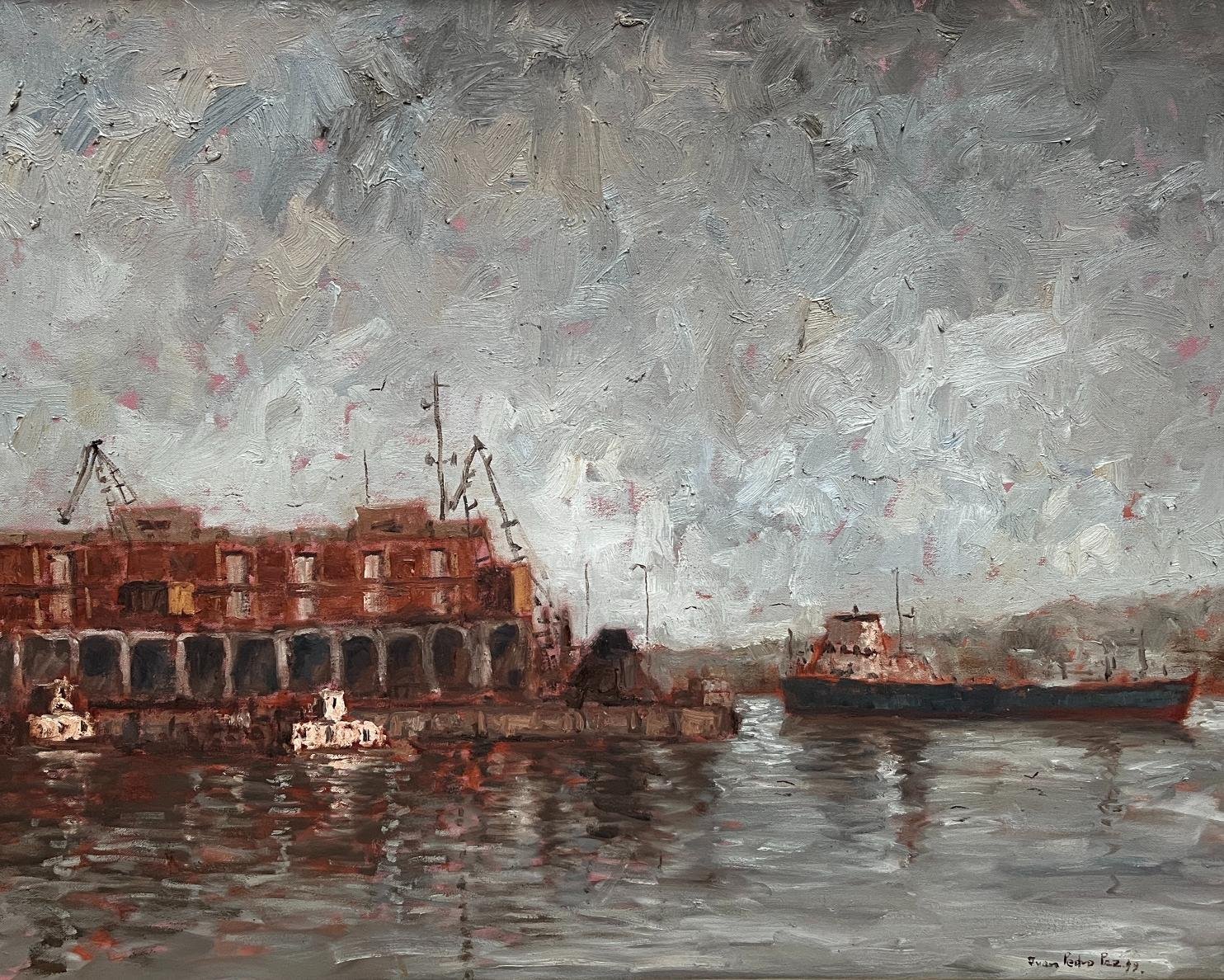 JUAN PEDRO PAZ (Escuela uruguaya, 1971) Óleo sobre tela «Puerto de Montevideo» Firmado y fechado «99» abajo a la derecha 71 x 91 cm