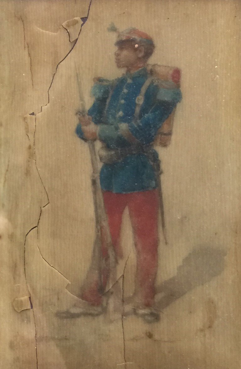 SANUY, Juan (Barcelona, 1856-1908). Acuarela sobre marfil. «Soldado uruguayo con fusil Remington Rolling Block.» Sin firmar. 9 x 6 cm. Fisuras en marfil.