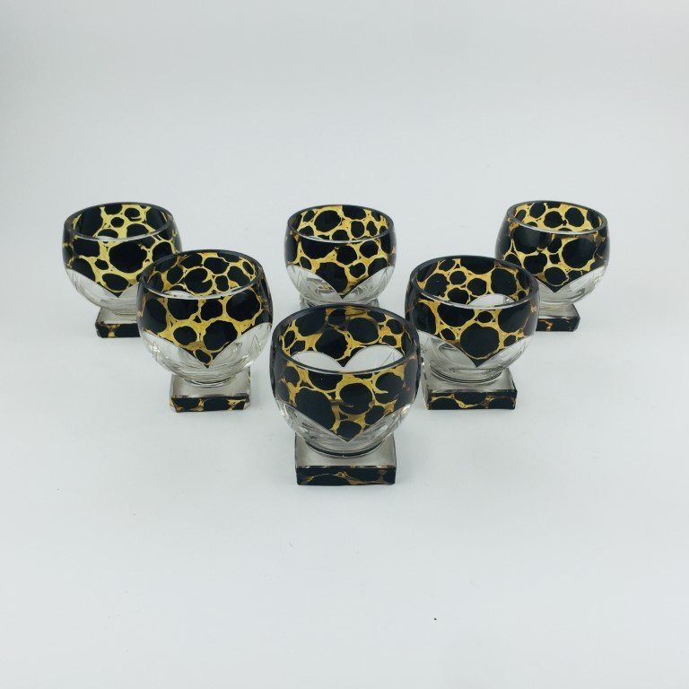 Juego art decó de botellón con tapón y seis copitas en cristal de Bohemia tallado y pintado «piel de guepardo». Medidas botellón 26 x 15 cm. Medidas copas 6.5 x 7 cm.