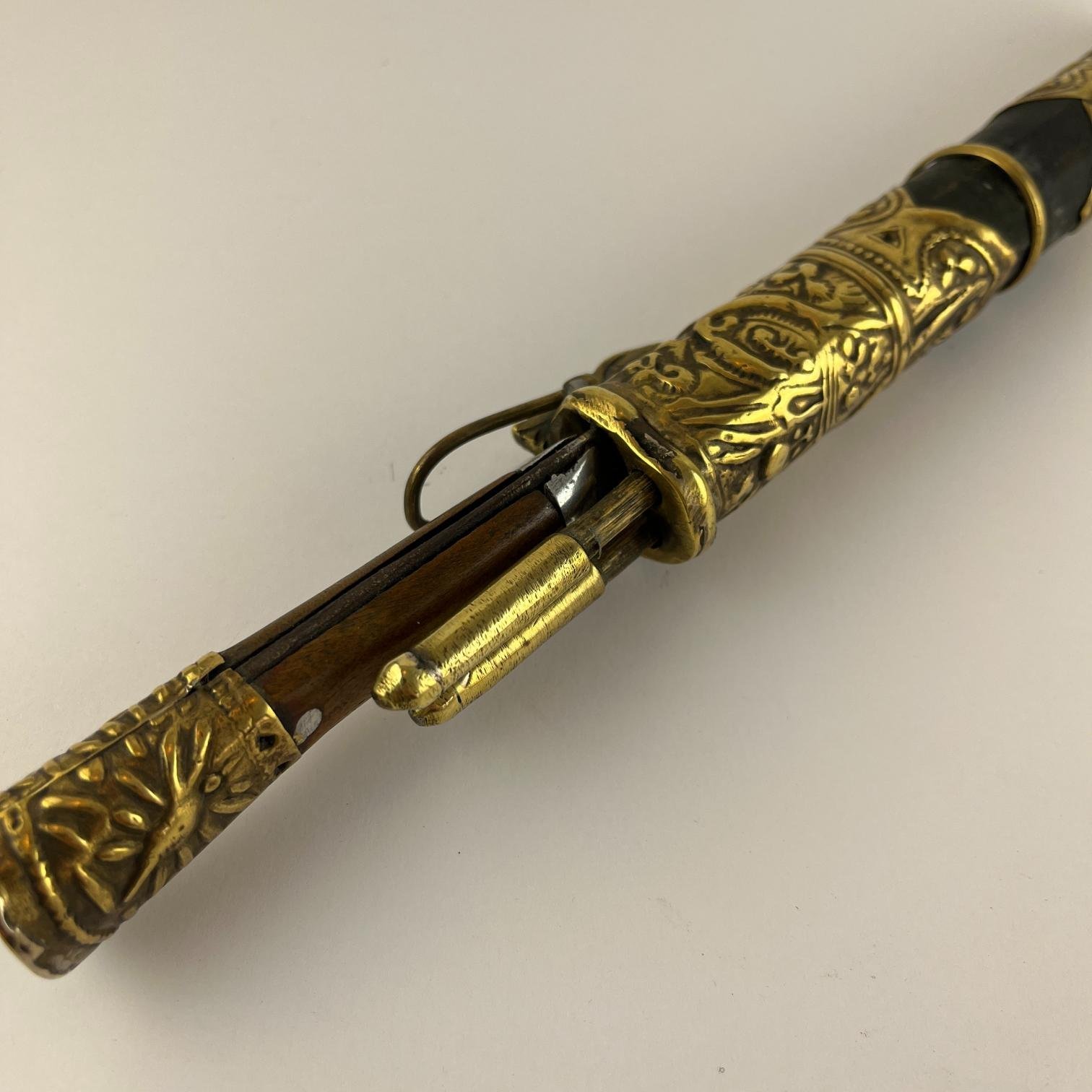 Juego birmano de cuchillo y par de palillos de viaje, en madera y bronce. Con estuche en madera ebanizada y monturas en bronce cincelado y repujado «flores». Largo total 26 cm.