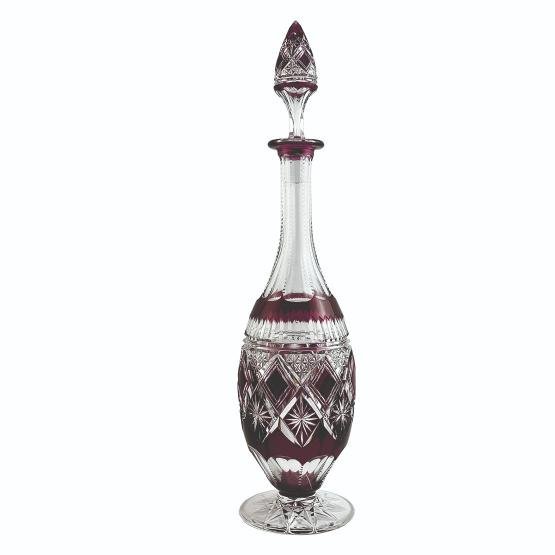 Juego de botellón y cinco copas en cristal tallado color violeta. Botellón con tapón, de un alto de 45 cm. Alto de copas 19,5 cm.