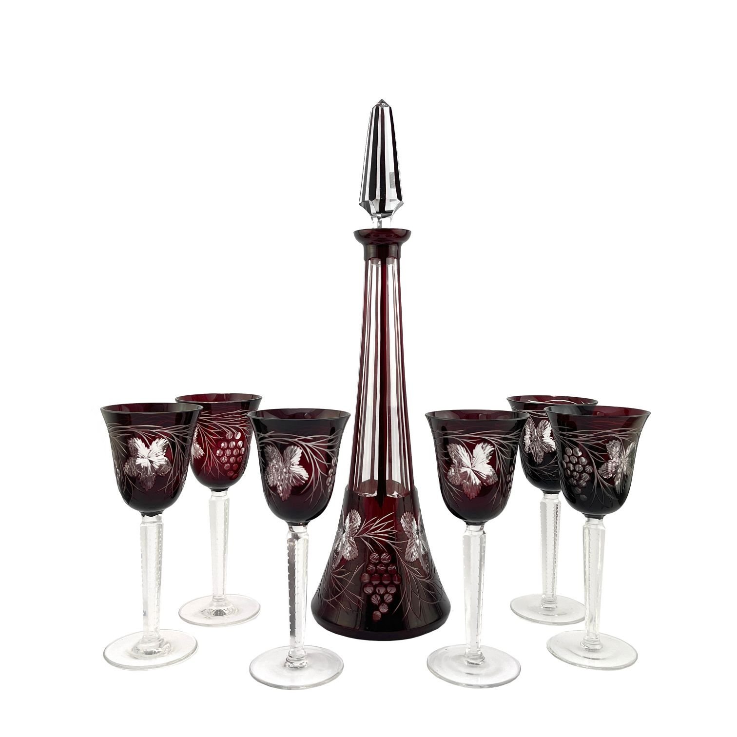 Juego de botellón y seis copas para vino blanco en cristal color bordeaux tallado «vides», con pies facetados. Alto botellón 49 cm, con tapón.