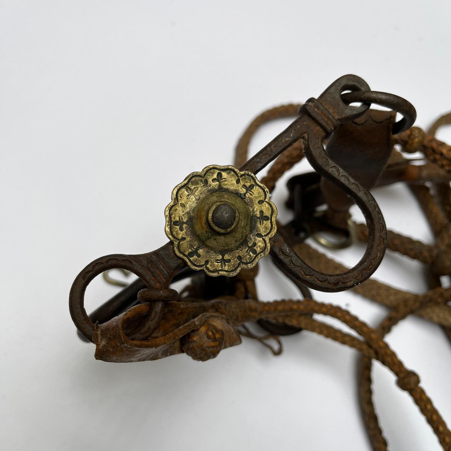 Juego de bozal, cabezada de freno, manea, par de riendas y pretal en cuero crudo decorado con fino cuero trenzado, con argollas en metal blanco. Freno en hierro forjado.